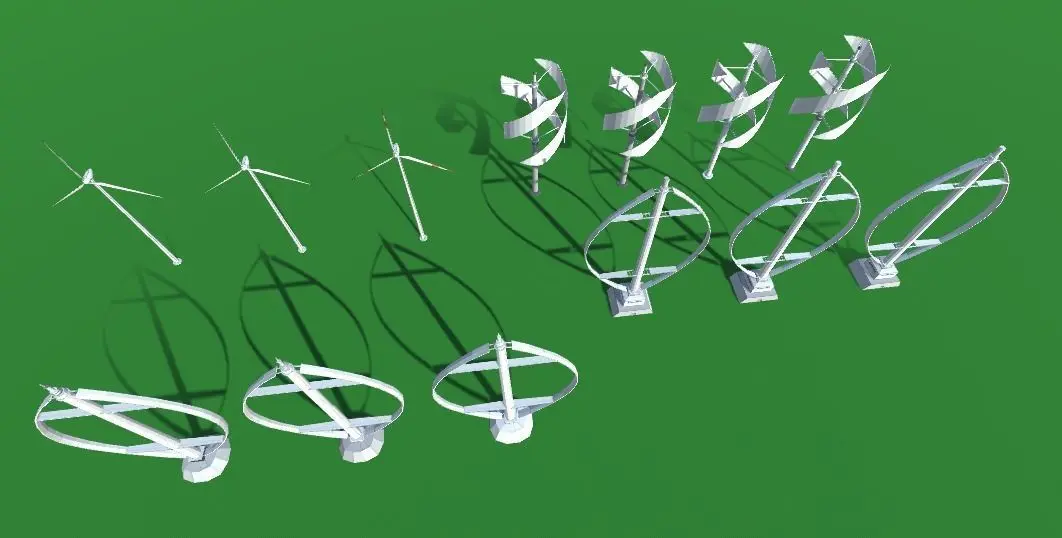 a collection of low-poly wind turbines / windmill power plantsstandard and vertical wind turbines includedideal for video gaming use (stylized, lowpoly, strategy, simulation, topdown,rts, etc)