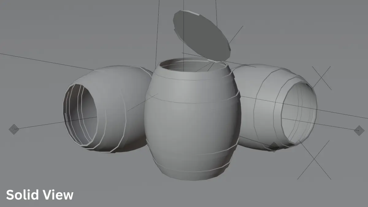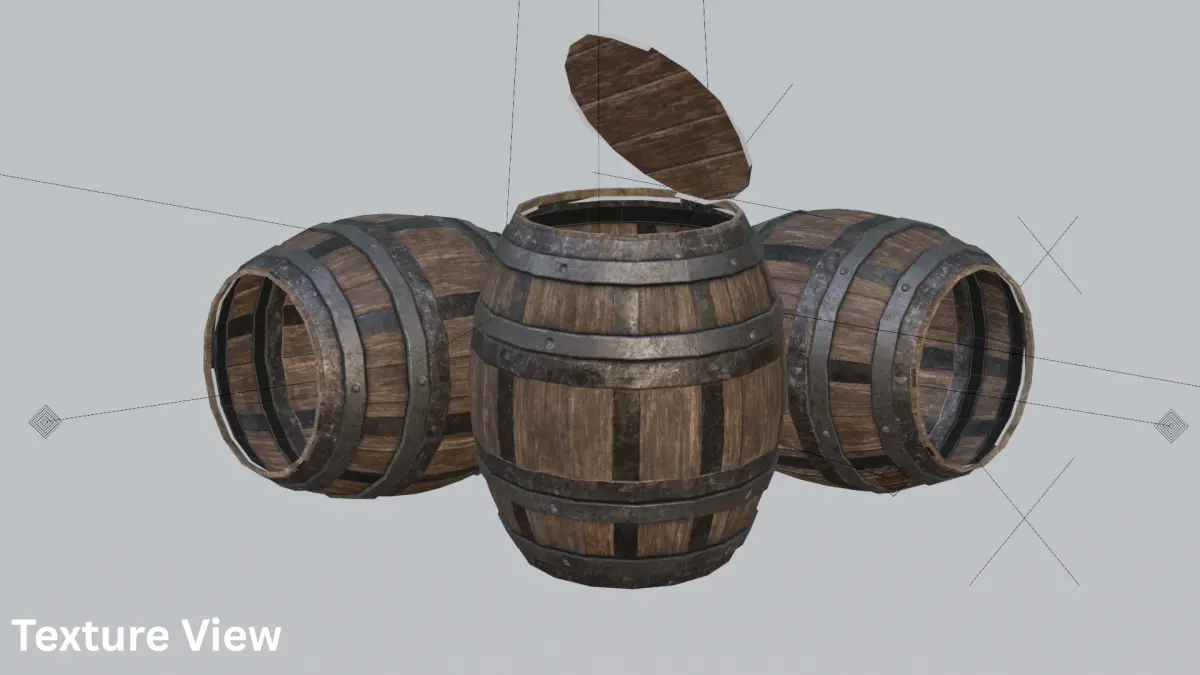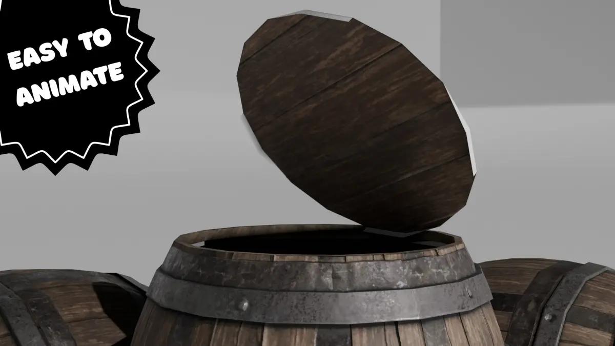 This is a stylized low poly wooden barrel optimized for use in games, animations, and real-time applications. It includes an easily animatable lid, making it perfect for interactive environments like RPGs, survival games, or mobile projects.