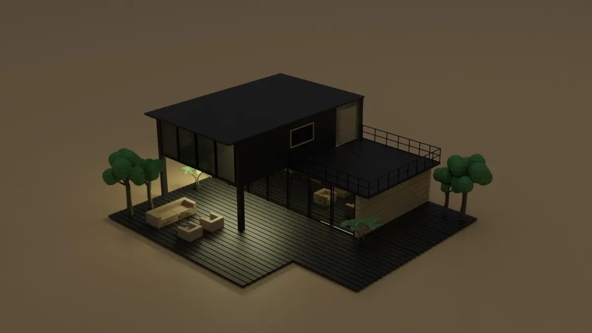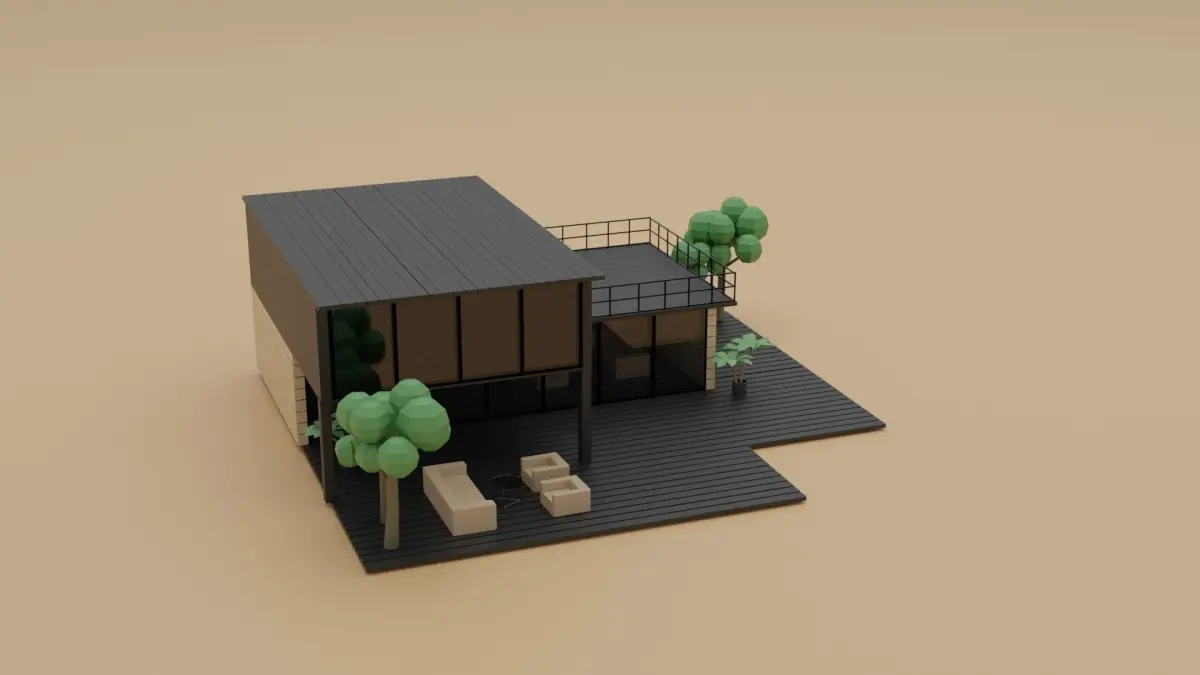 Low Poly Wooden House. The package includes a low poly modern house with black and regular wood colors, exterior furniture, lights, vegetation and interior plants. The files available for download are: .blend; .obj; .mtl; .stl. The renderings were made using Cycles.