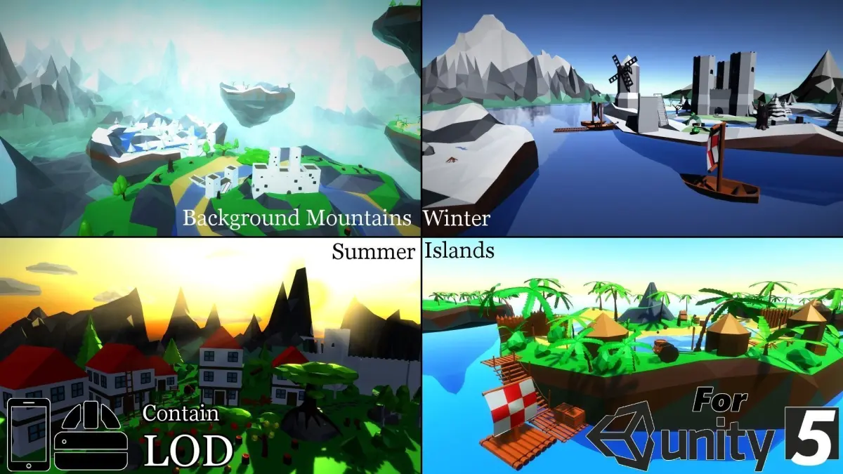 Requires Unity 5.3.5 or higher.Low poly world creator kit contain many elements from 4 smaller environment. It can help you create a nice looking indie stylized game. Most of assets have 2 lod versions, you can use one or both of prefabs it depends on your graphics imagination. Items we can devide for groups like: