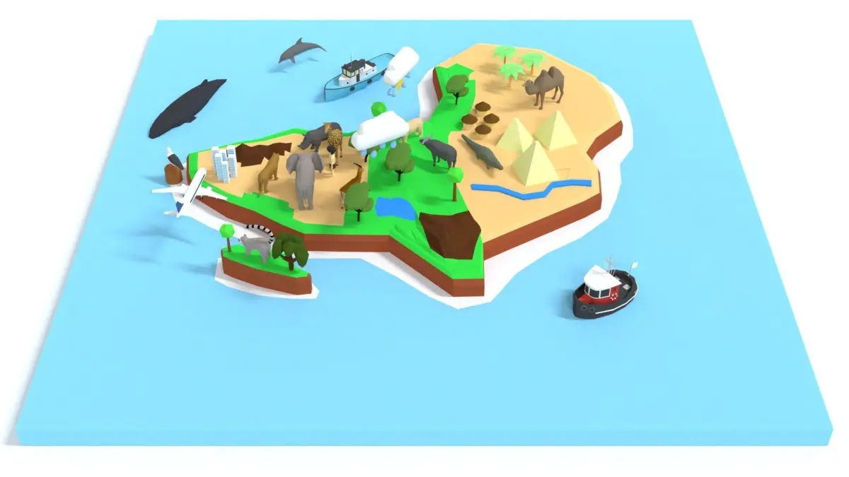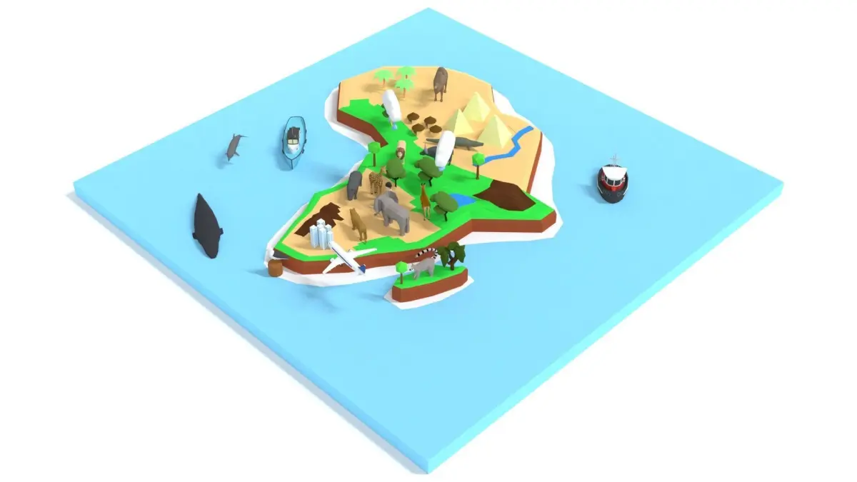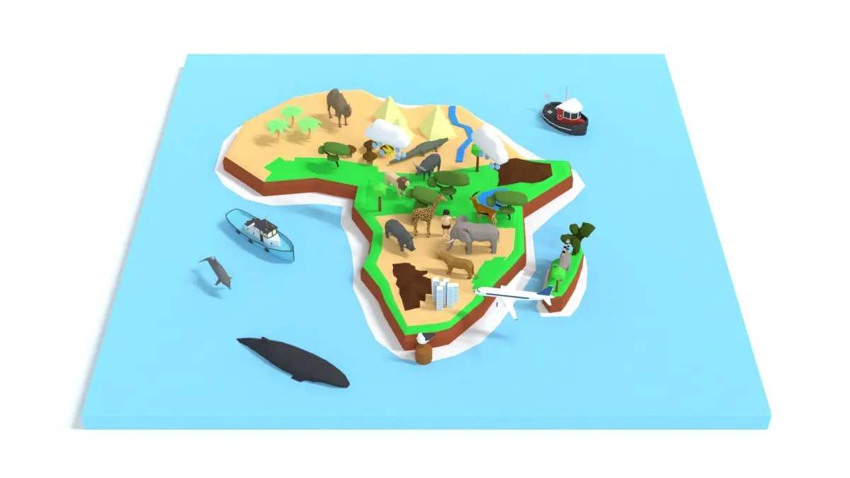 This is a low poly 3D model of an Africa map with 13 low poly animals. The low poly map was modeled and prepared for low-poly style renderings, background, general CG visualization presented as 41 meshes with quads/tris.