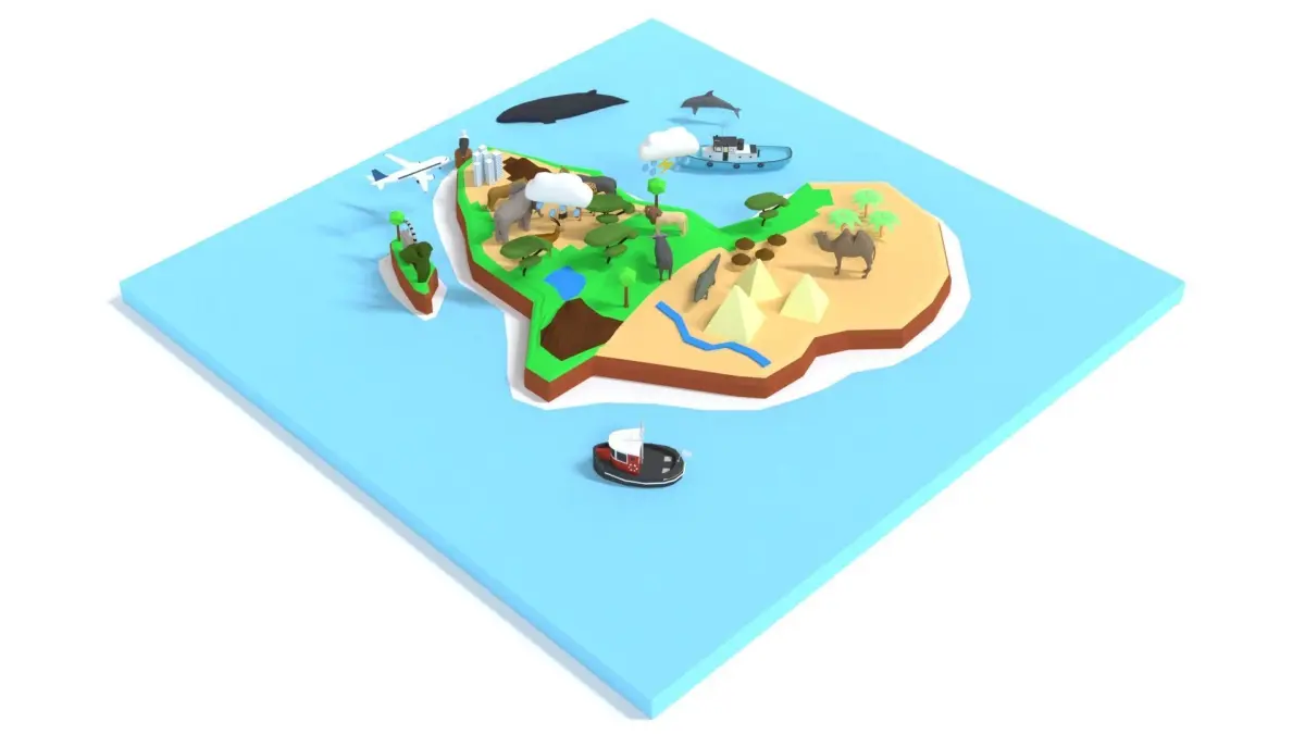 12 Trees1 Tarzan Character 1 Fishing Boat1 Candu Mini Tugboat1 Airbus A3203 Pyramids4 HutsSkyscrapersCloudsRiver
