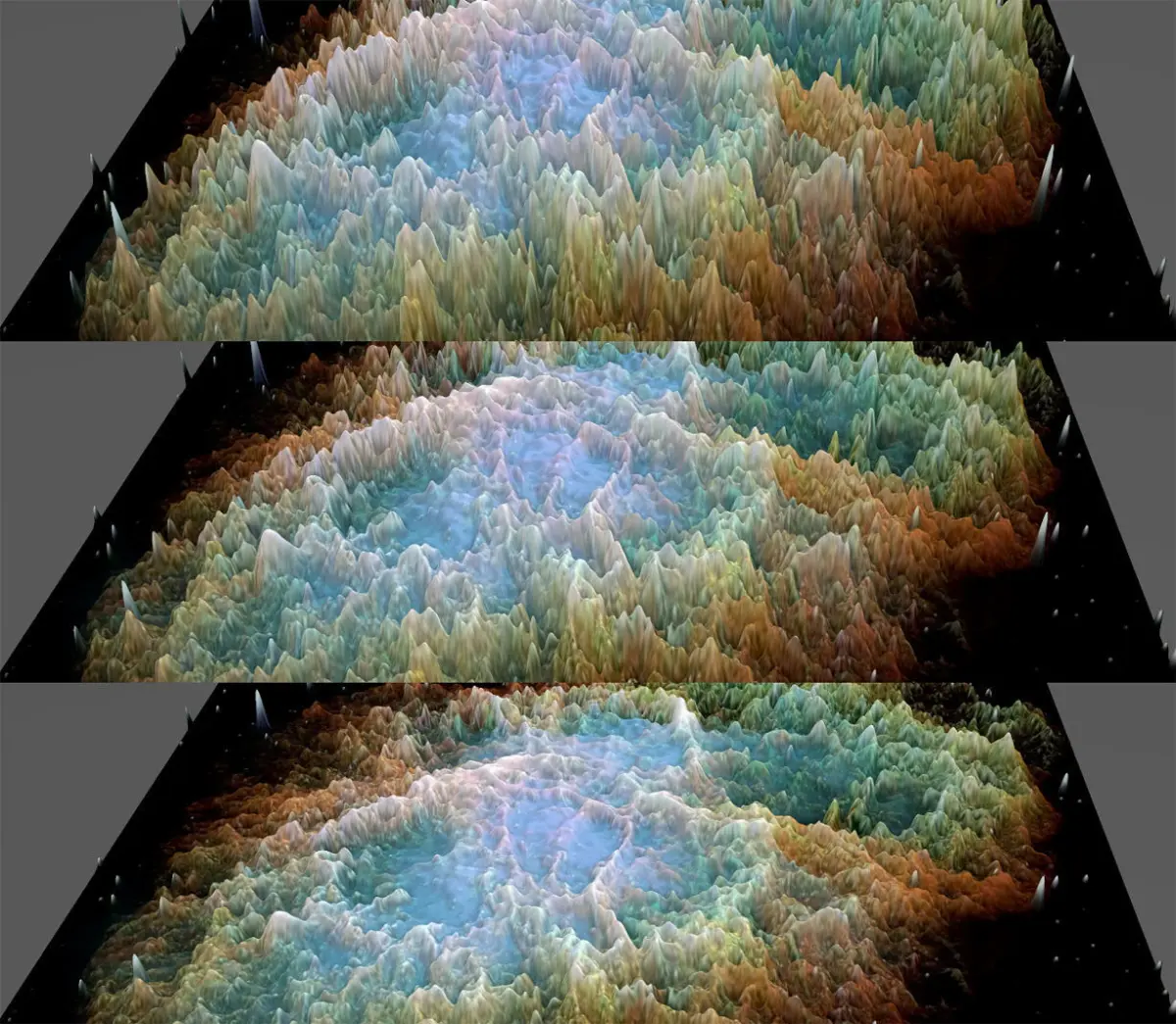 3D image obtained as a result of soft analysis of the 2D images of the new Hubble Space Telescope. The technique based on color analysis highlights the light of stars and ionized gases from the darkness of space, as gravity curves space, thus creating a spatially interpretable high-resolution 3-dimensional work.