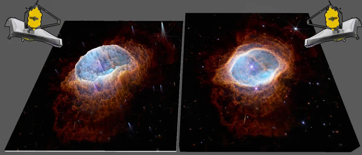 3D image obtained as a result of soft analysis of the 2D images of the new Hubble Space Telescope. The technique based on color analysis highlights the light of stars and ionized gases from the darkness of space, as gravity curves space, thus creating a spatially interpretable high-resolution 3-dimensional work.