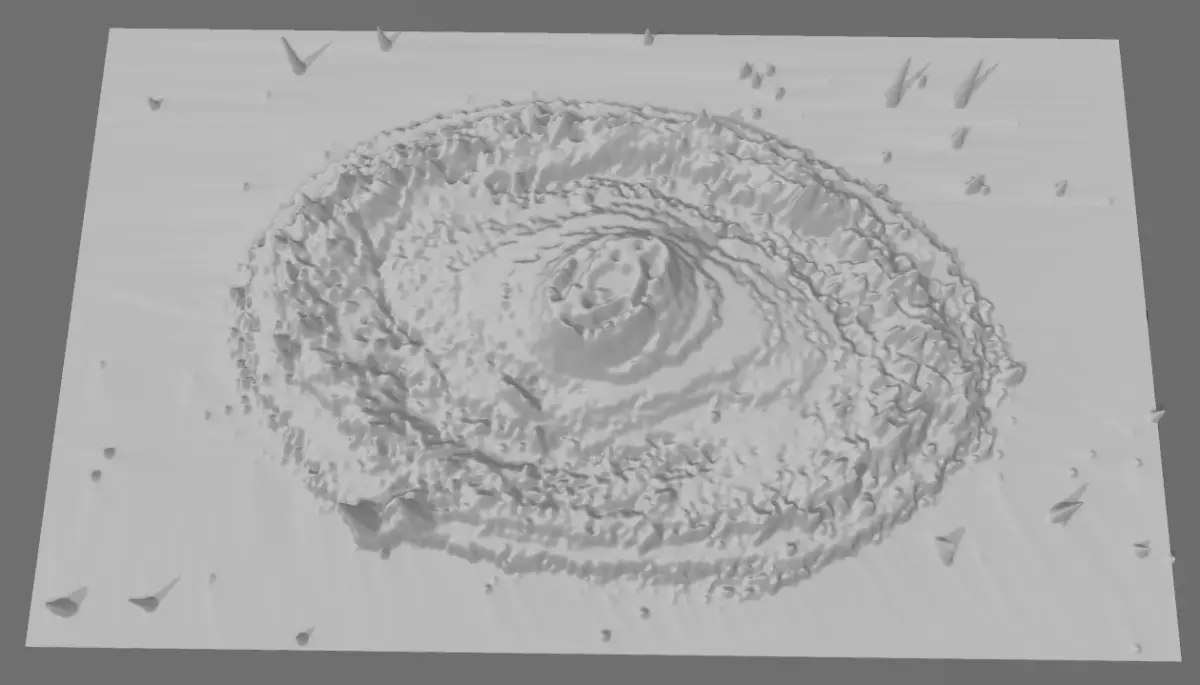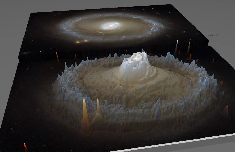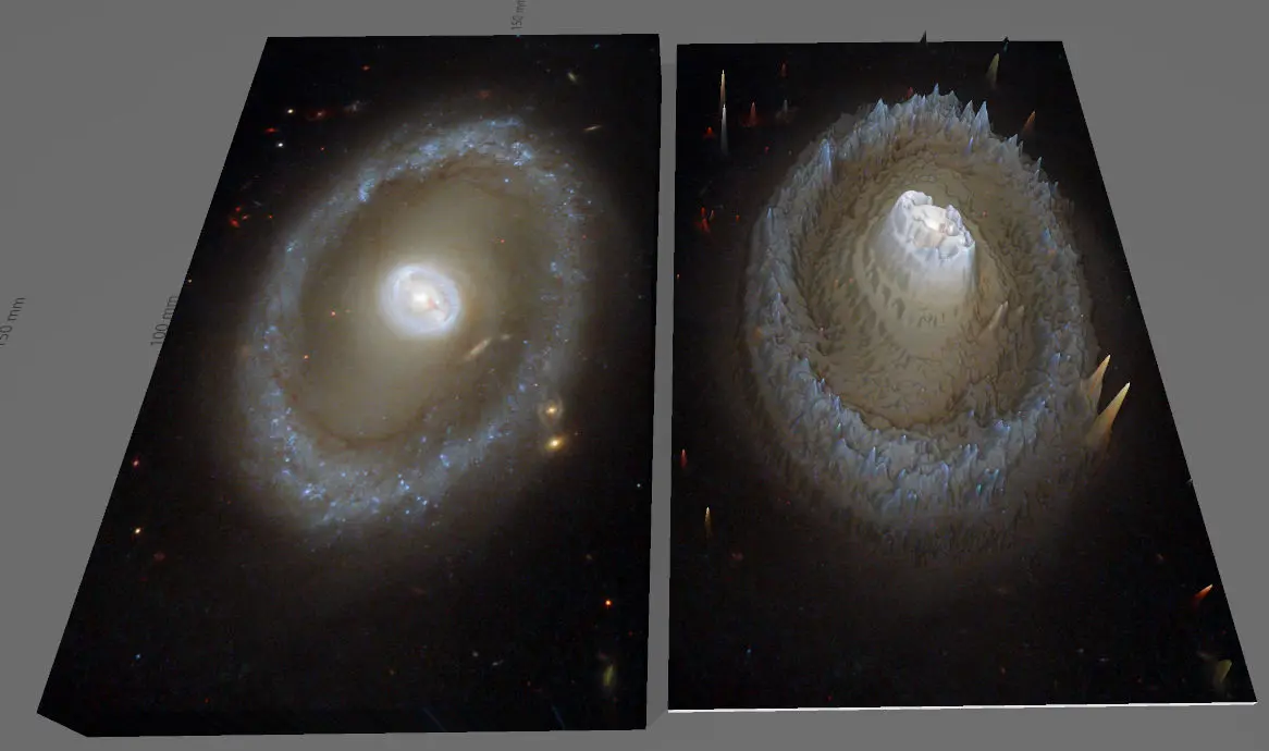 Huge spiral galxy, whose light traveled thousand years for the our Spaces Telescope to record its photons! Where the material becomes denser, as a result of physical processes, it will be brighter and warmer, like as the sun! Somehow, the thickening matter creates deeper and deeper holes in space-time. Based on this, I created the negative gravity map of the image with the help of software, as gravity distorts a deep pit in space-time, the texture rises on the model, thus creating gravity mountains!