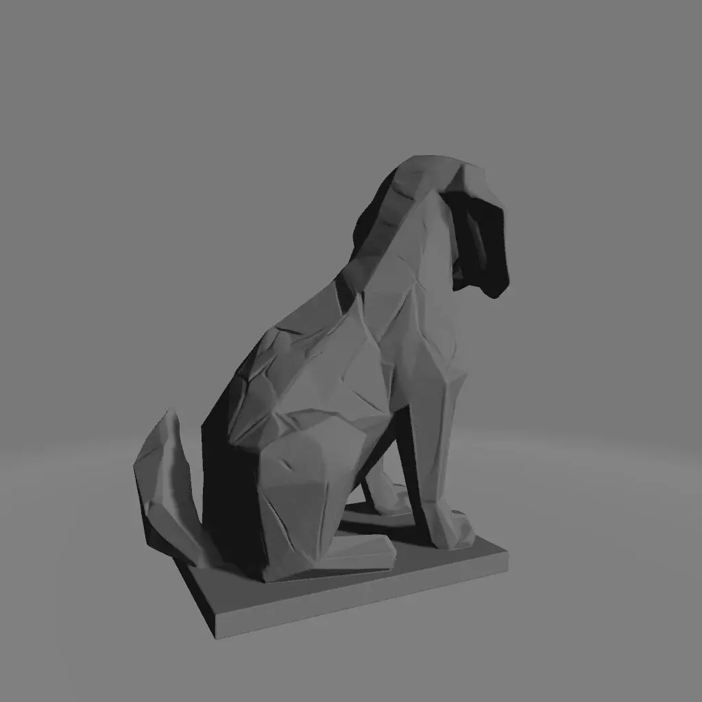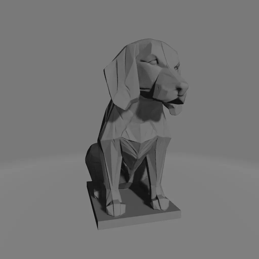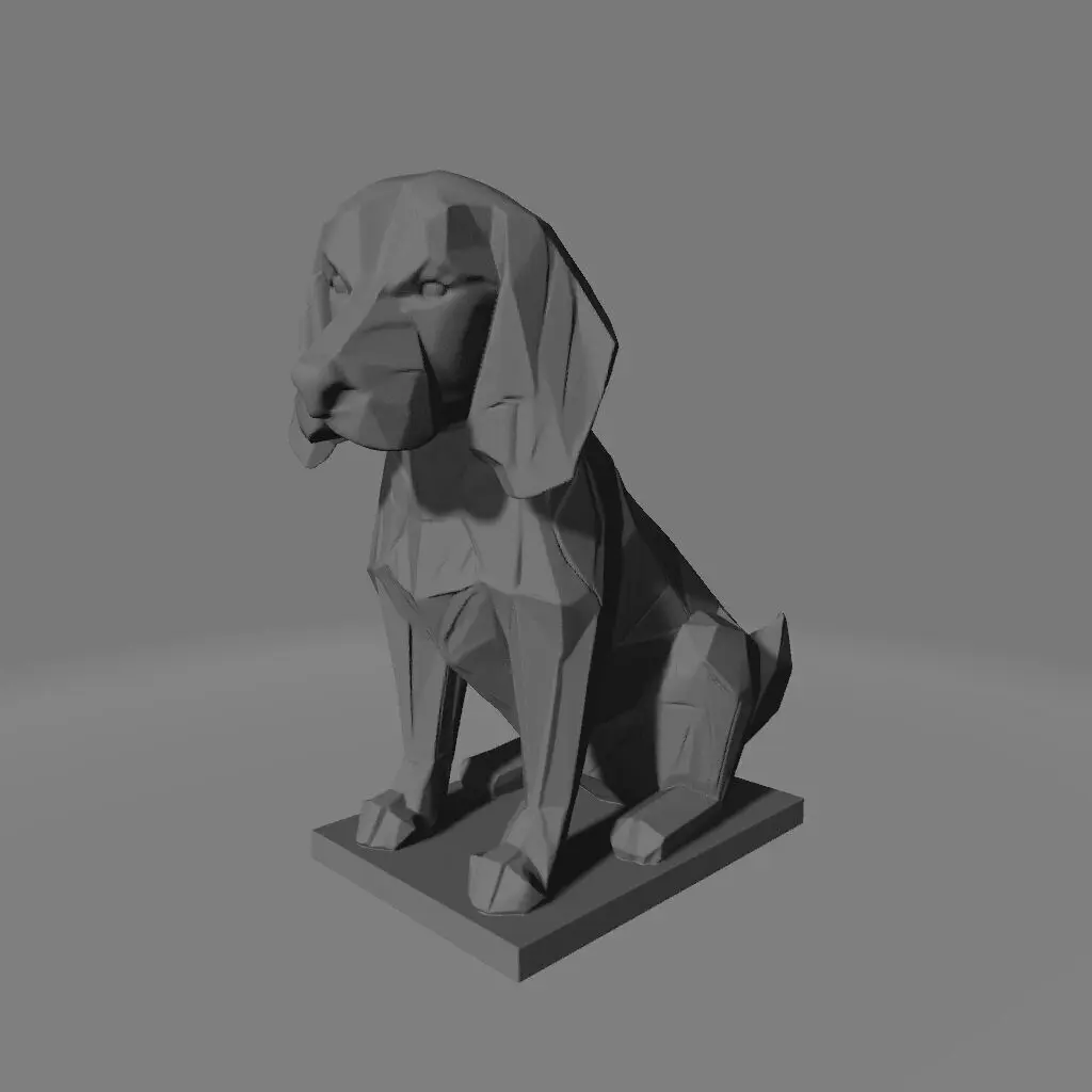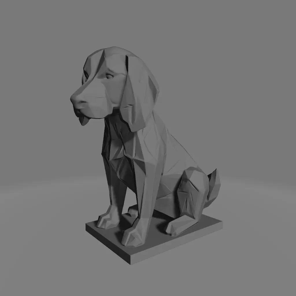 A low-poly 3D printed statue of a beagle dog, featuring sharp geometric facets and clean edges that capture its iconic sitting pose. The design highlights the beagle's long ears and friendly expression in a simplified, angular style. The statue is crafted for stability, with a broad base ensuring secure placement, making it a modern, stylish piece for display.