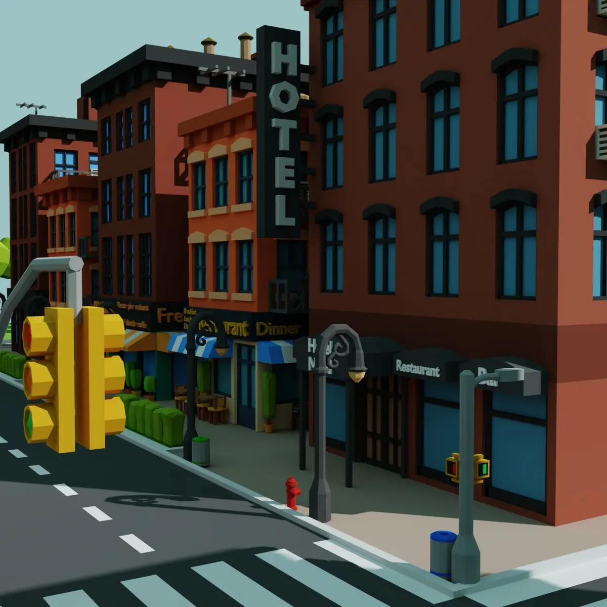 Lowpoly city Brooklyn architecture style.Small lowpoly city,a city where there is a hotel, a bakery, a cafe10 unique houseMarketBasketball fieldtwo lamppoststhree types of treesbush,Road crossroads, pedestrian crossing,parkingTree, hydrant, postbox, benches, trash can, traffic light.