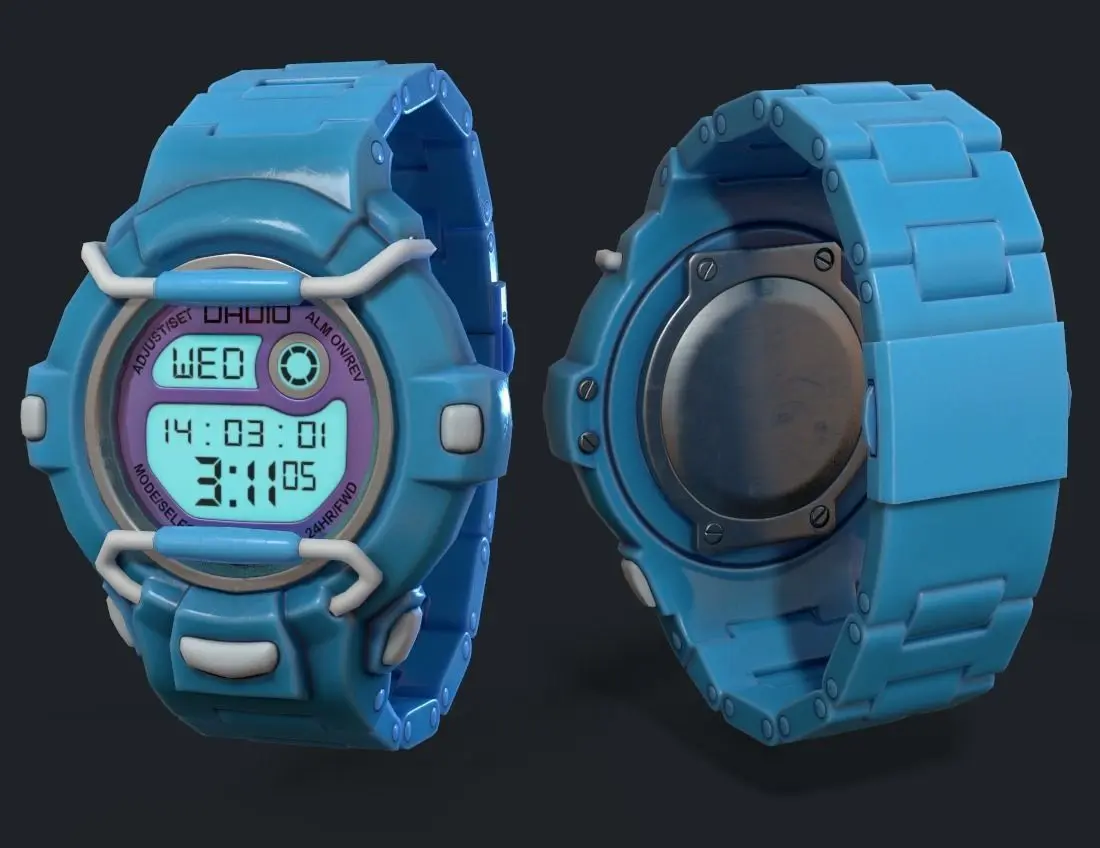 game ready lowpoly digital watch with PBR metal-rough textures. folder includes OBJ, FBX, TGAs and substance painter file. textured include emissive for digital screen.