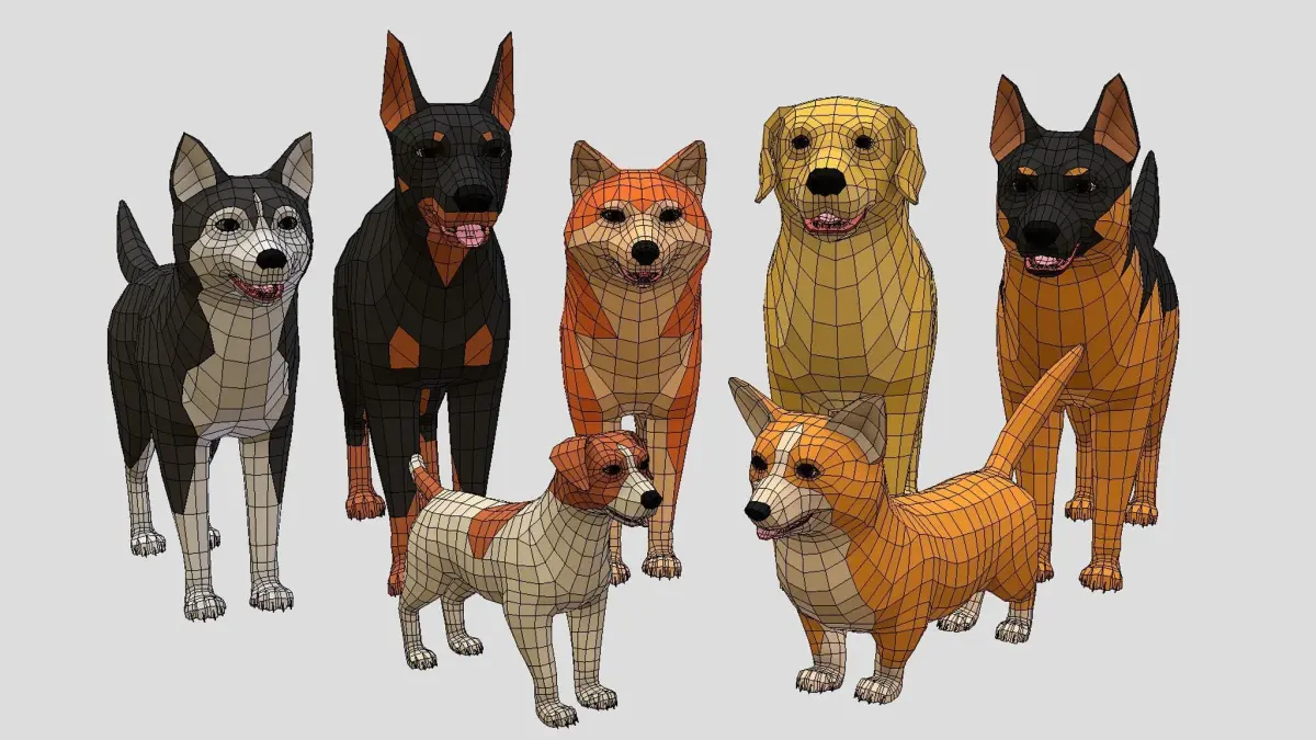 Dogs: Shepherd, Akita-Inu, Corgi, JR Terrier, Husky, Doberman, Retriever. The models has 4000 - 4500 tris and 53 bones. Texture map - only one albedo 1k.