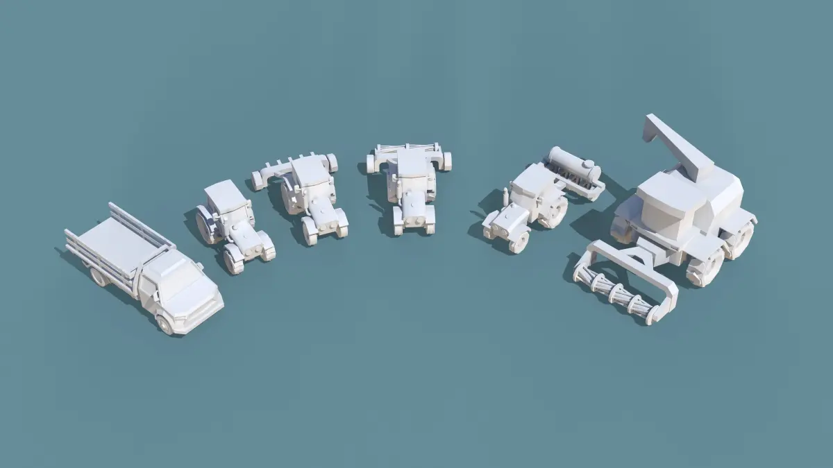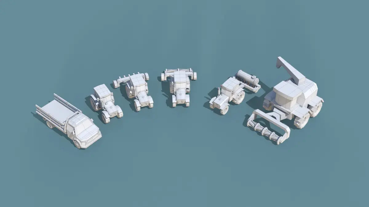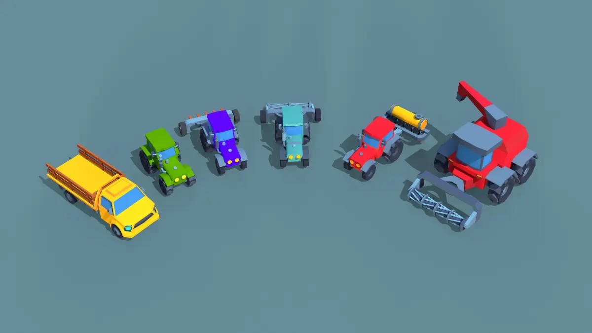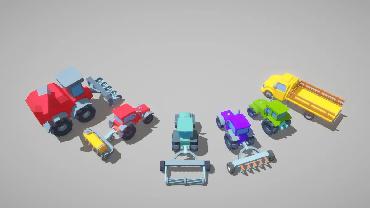 This low-poly farming vehicle pack includes a total of 6 vehicles. All vehicles have only one simple, lit material with one texture, so the UV maps are overlapped; there is no uniform UV mapping. You can use this pack for AR, VR, mobile, PC platform games, or other projects.