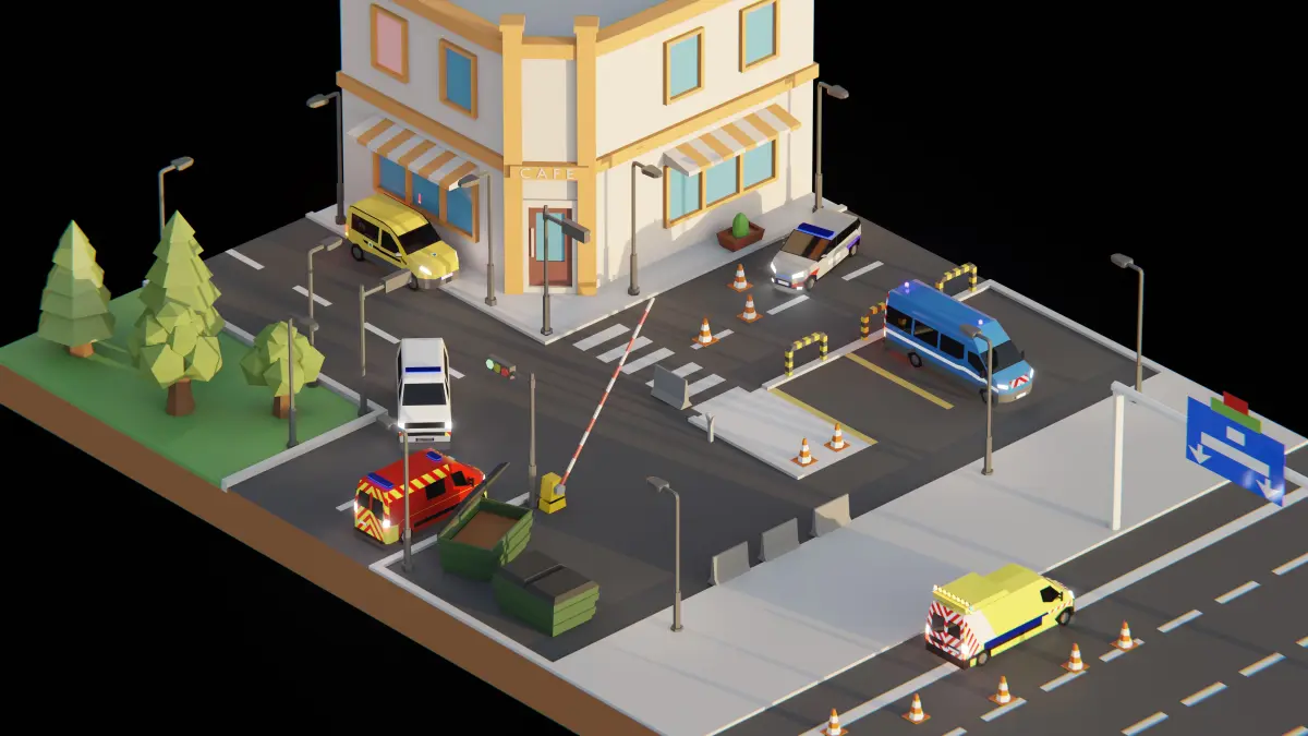 English Title: Low Poly French Public Service Vehicles Pack - Vinci Autoroutes, SMUR, Police, Firefighters, La Poste, Gendarmerie