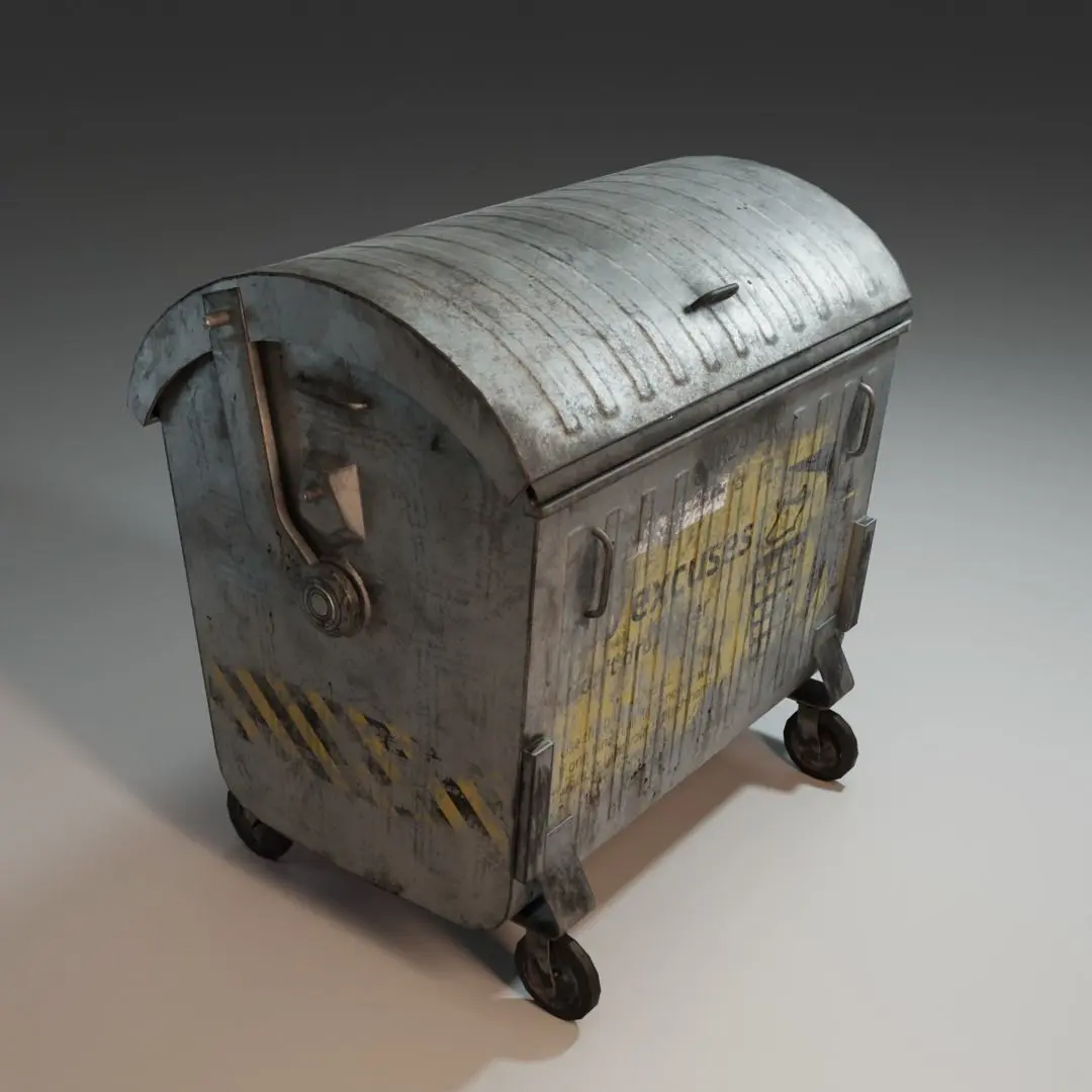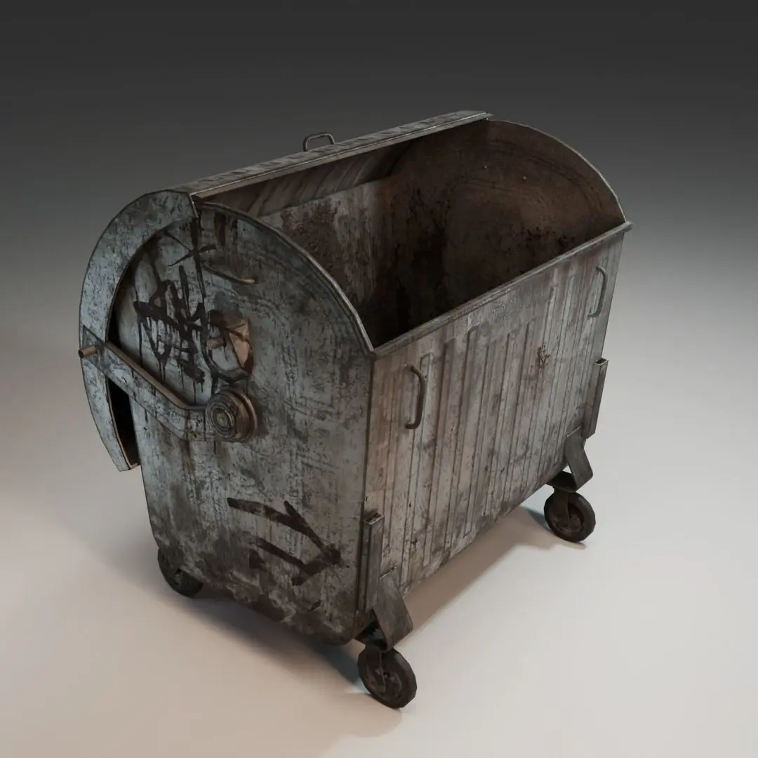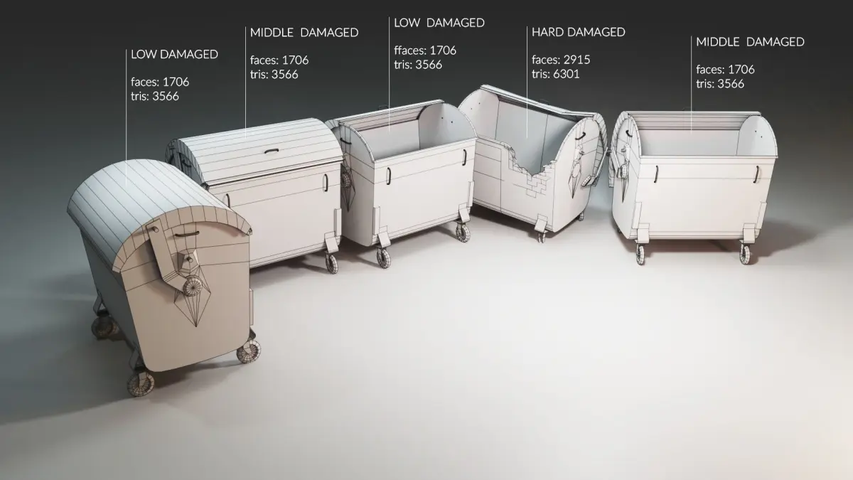 A pack consisting of 5 low-poly models of trash bins with varying levels of damage.