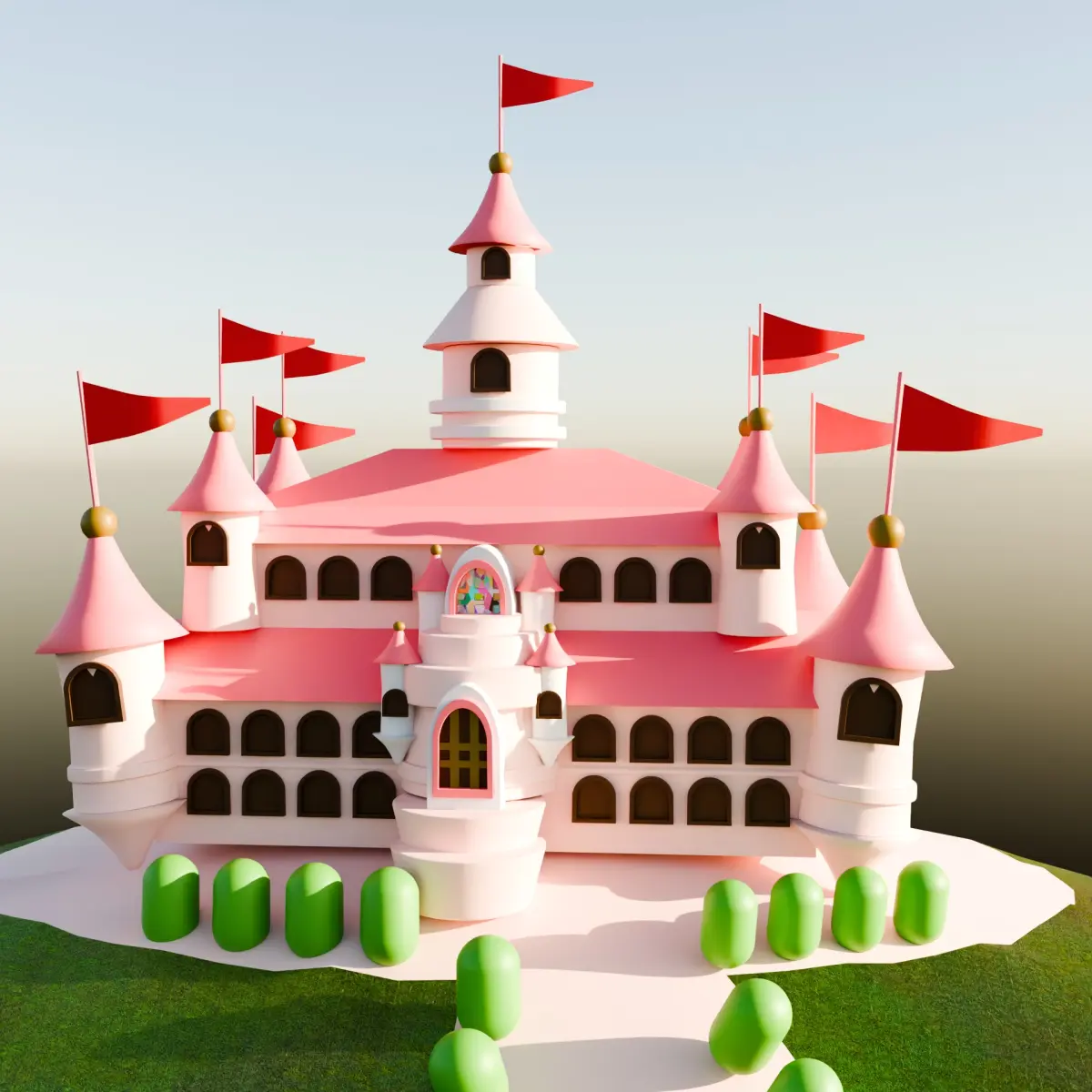 LowPoly cute pink castle for envirnment or backgroundA low-poly isometric 3D castle designed for a princess presents a whimsical and charming scene. The castle is constructed using clean, geometric shapes, featuring tall, pointed towers, and a majestic central keep. The exterior is adorned with pastel-colored walls, turrets, and flags fluttering in the breeze, adding a fairytale-like feel. Surrounding the castle is a lush garden with low-poly trees, flowers, and a winding path leading to a grand entrance. The castle's large arched windows and stylized drawbridge enhance its magical atmosphere. The low-poly aesthetic gives the scene a playful, artistic style, making it perfect for a storybook princess fantasy world.