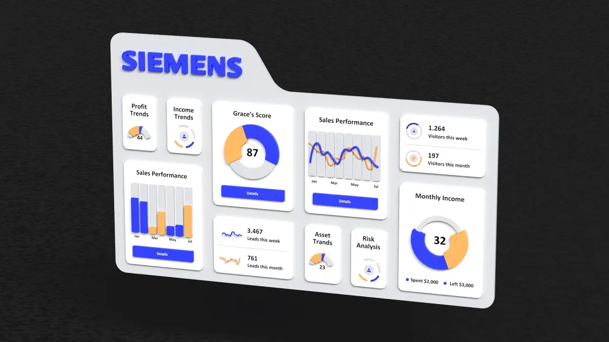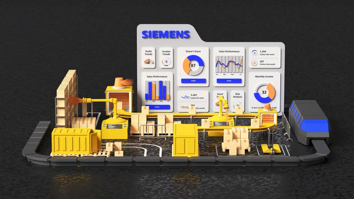 This low-poly 3D illustration represents a modern industrial logistics hub with detailed, animated elements. The scene includes an automated shelving system transporting boxes, a moving train, a conveyor belt, robotic arms with scanning capabilities, and a dynamic dashboard featuring live-updating graphs and data. Key objects such as pallets, crates, forklifts, and industrial scanners contribute to the realistic warehouse environment.
