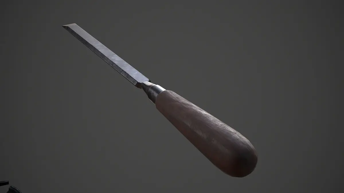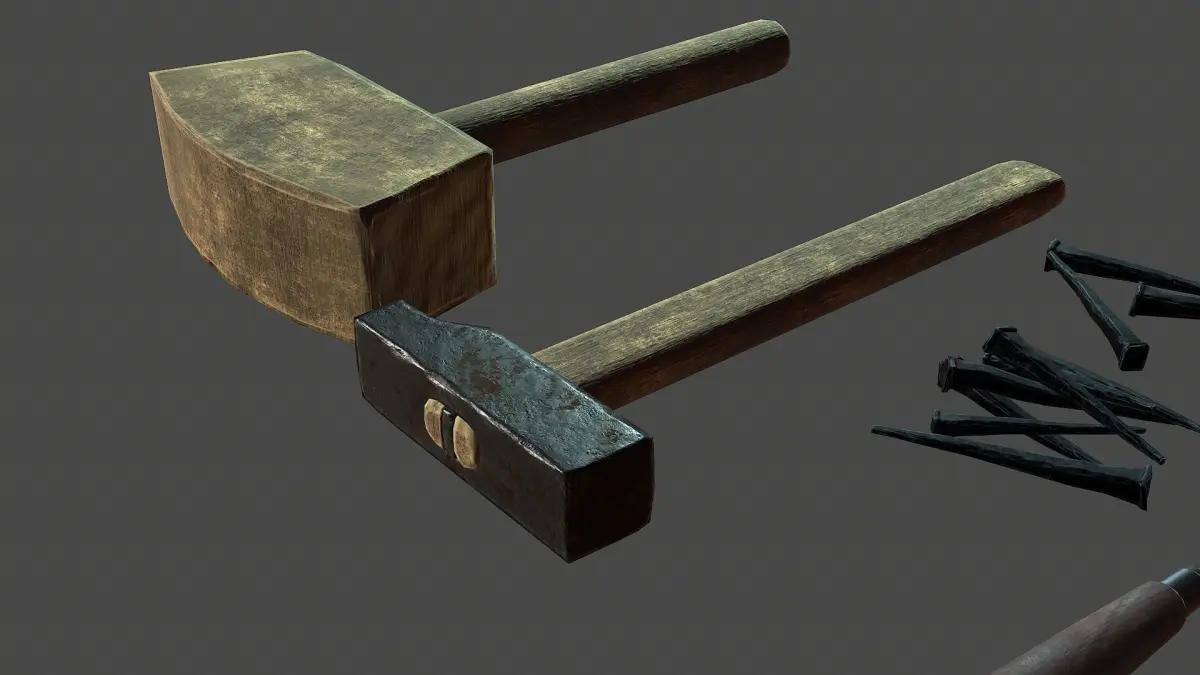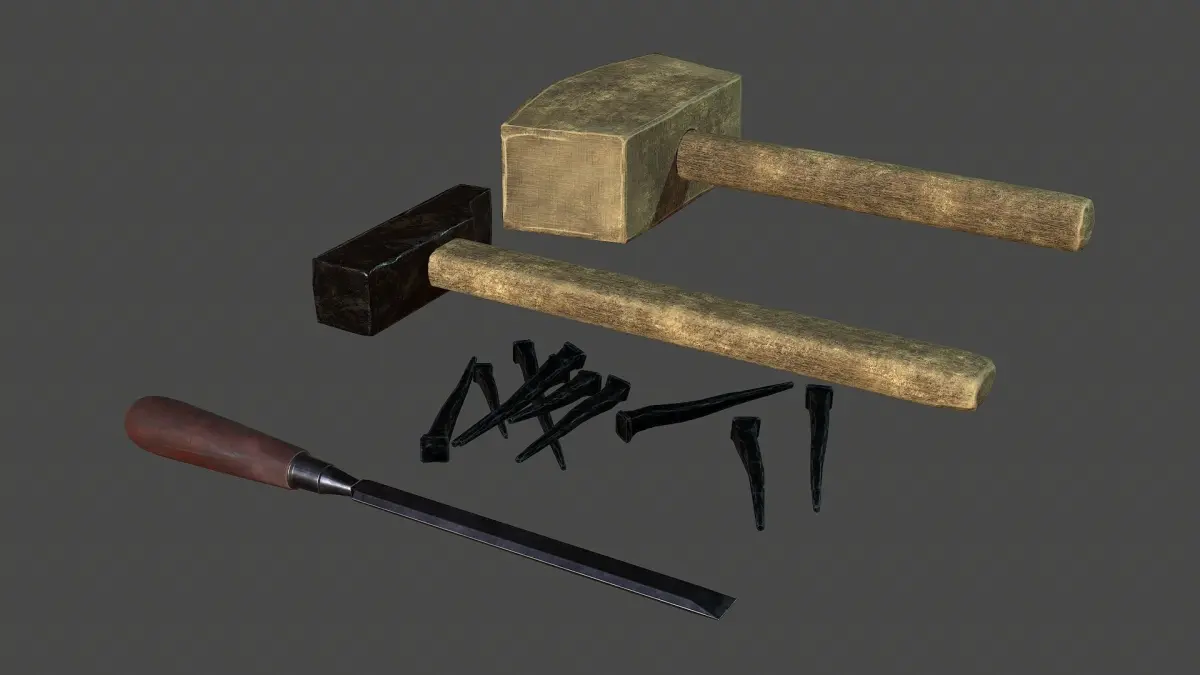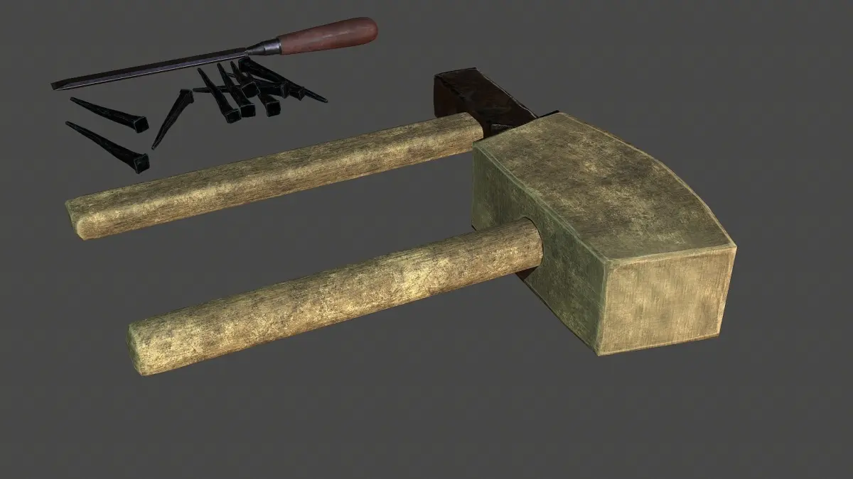 This is a lowpoly model of tools (mallet, hammer, chisel, nails).
