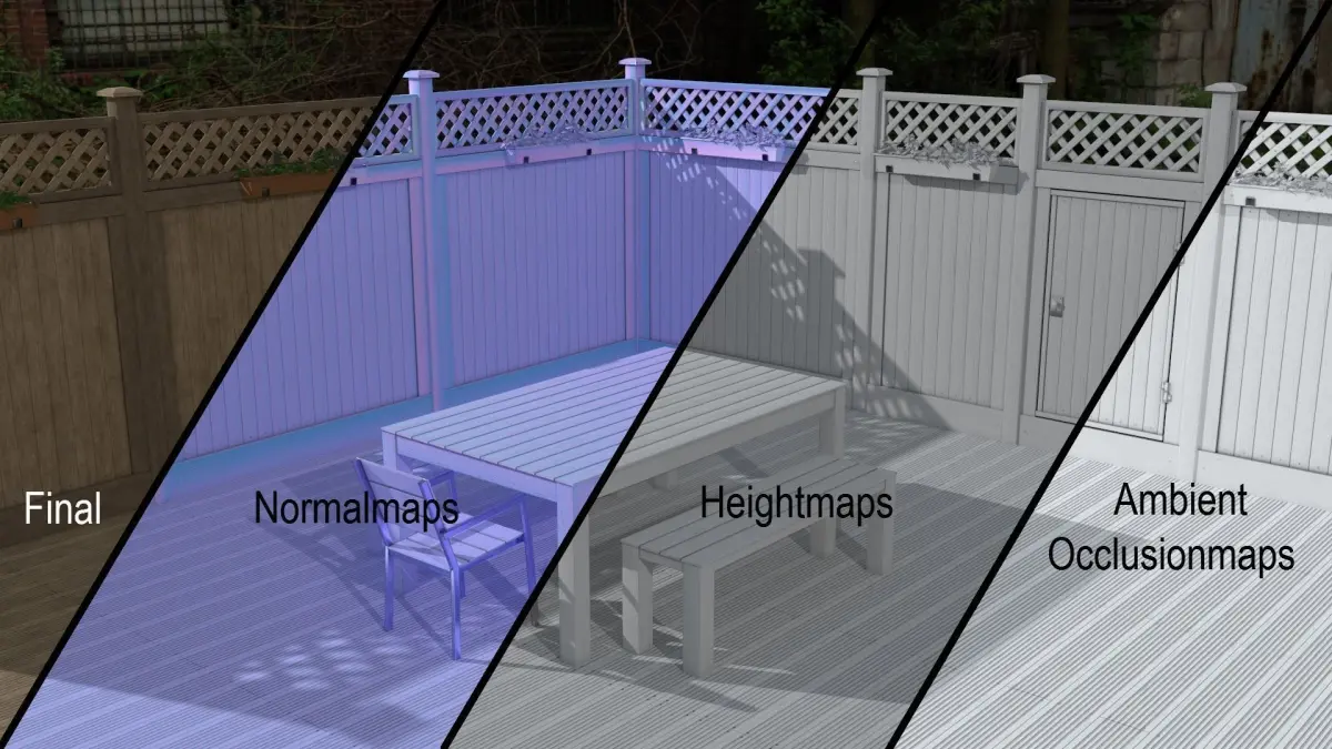 This set contains these separately modelled objects: Name (number of triangles)-Pole (92)-Large Fence (296)-Medium Fence (188)-Small Fence (120)-Overhang (178)-Low Doorway (post(240) + door(336)) -High Doorway (post(234) + door(336))(origin points of doors are placed at the hinges for simple animating)-Table (192)-Bench (108)-Chair (230)-Connectable Flowerpot (946)-Floorpanel with baked bankirai (2)