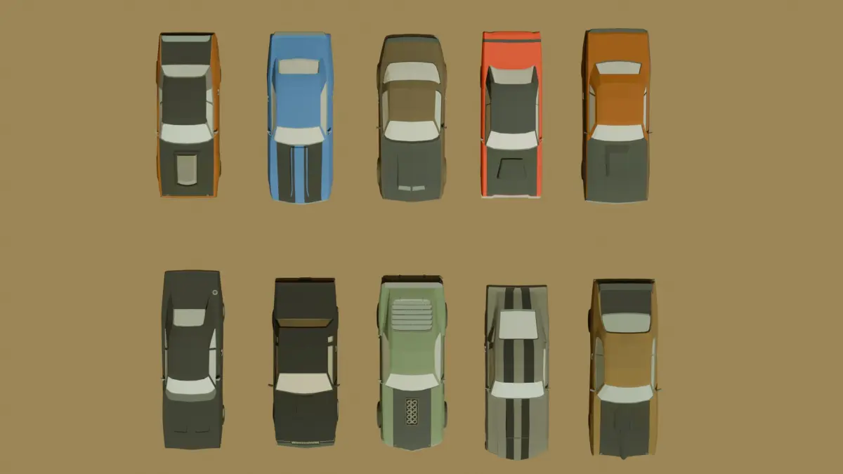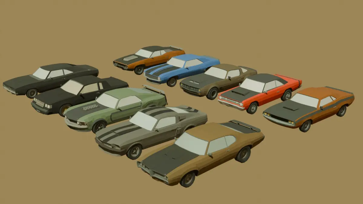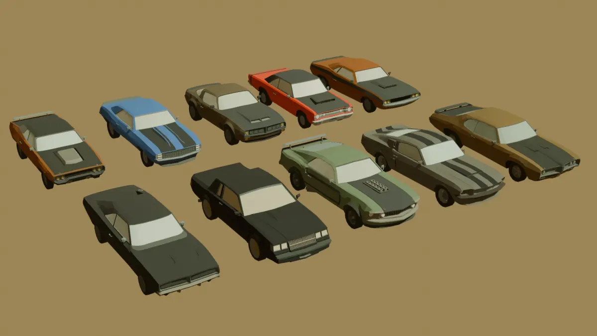 Set of 10 low poly muscle cars. All the models are inspired by real late 60-70's American muscle cars.Doodge charger R/T, Pontiac GTO, Mustang Boss, buick grand National and more.