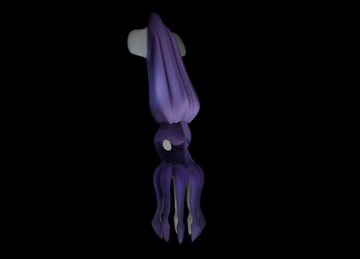 Low poly squid model. Fully rigged with a total of 102 bones, ready for animation. All eight tentacles have identical bones throughout (12 per tentacle), and the head is rigged with six bones. Textured thumbnails are rendered with level 2 subdivision, displaying the included texture maps. Wireframe images are rendered displaying level 1 subdivision.
