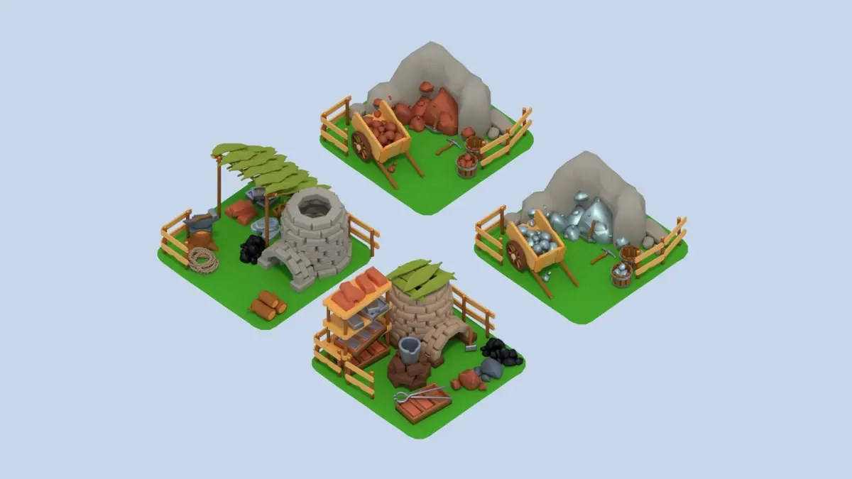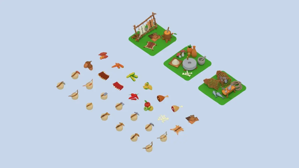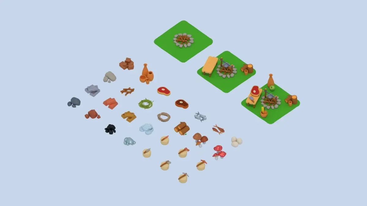 A low poly asset pack of buildings, props, instruments, food and natural items assets to create a survival based polygonal style game.