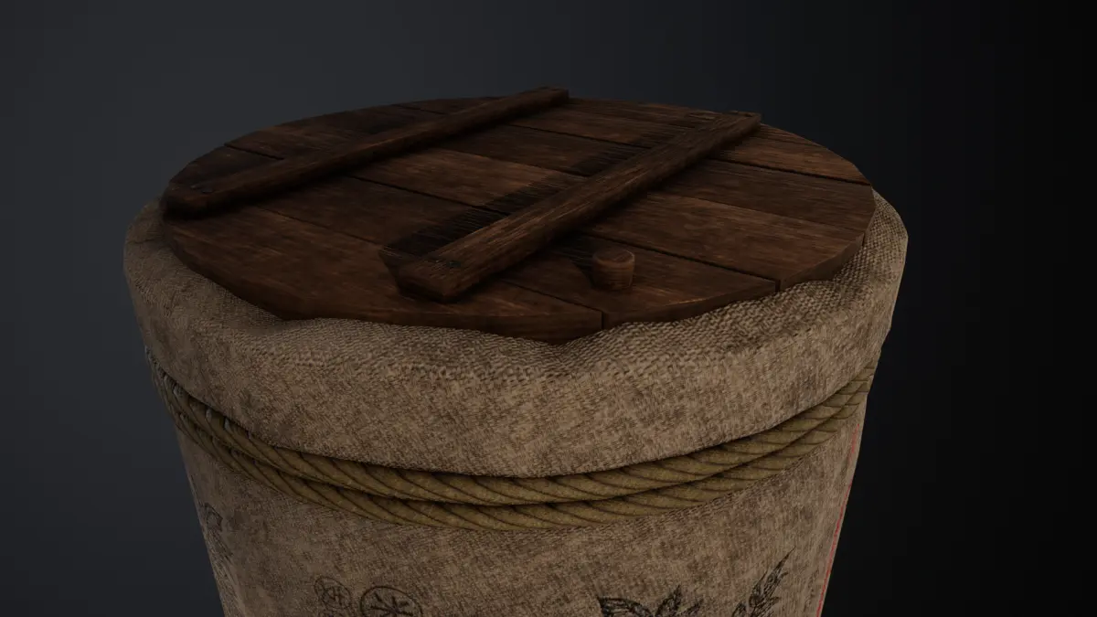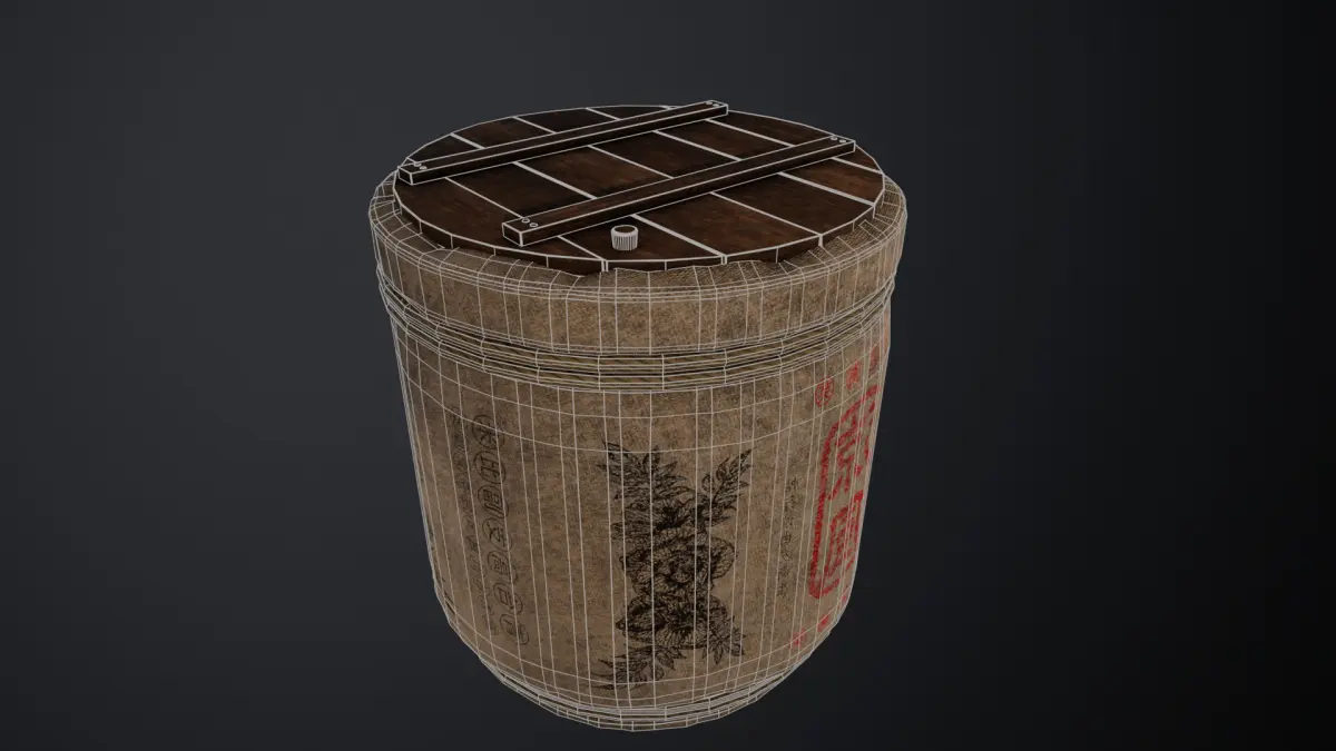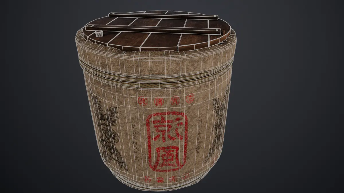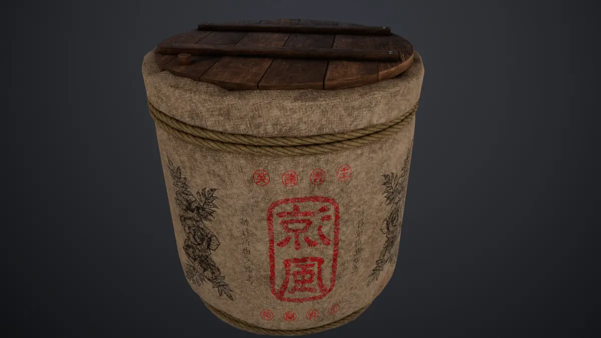 This is a lowpoly 3D model of a traditional Japanese sake barrel, commonly used for decorative and ceremonial purposes. The model is designed with an optimized polycount, featuring detailed textures that replicate the authentic look of wood, fabric, and rope.