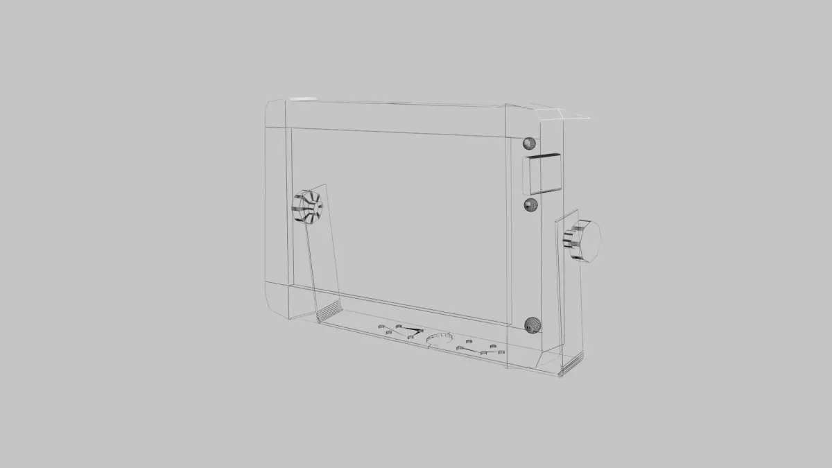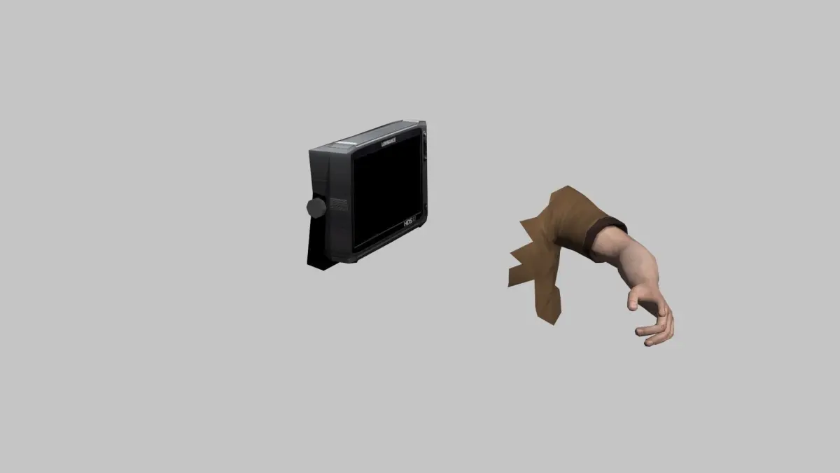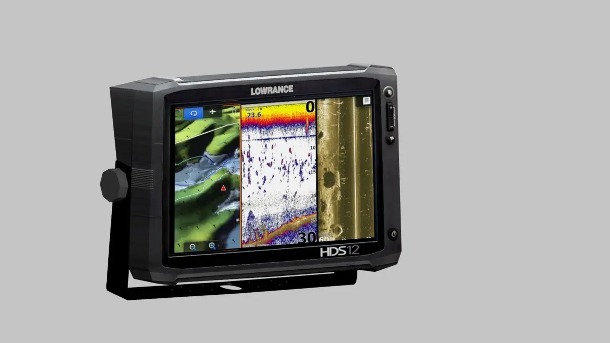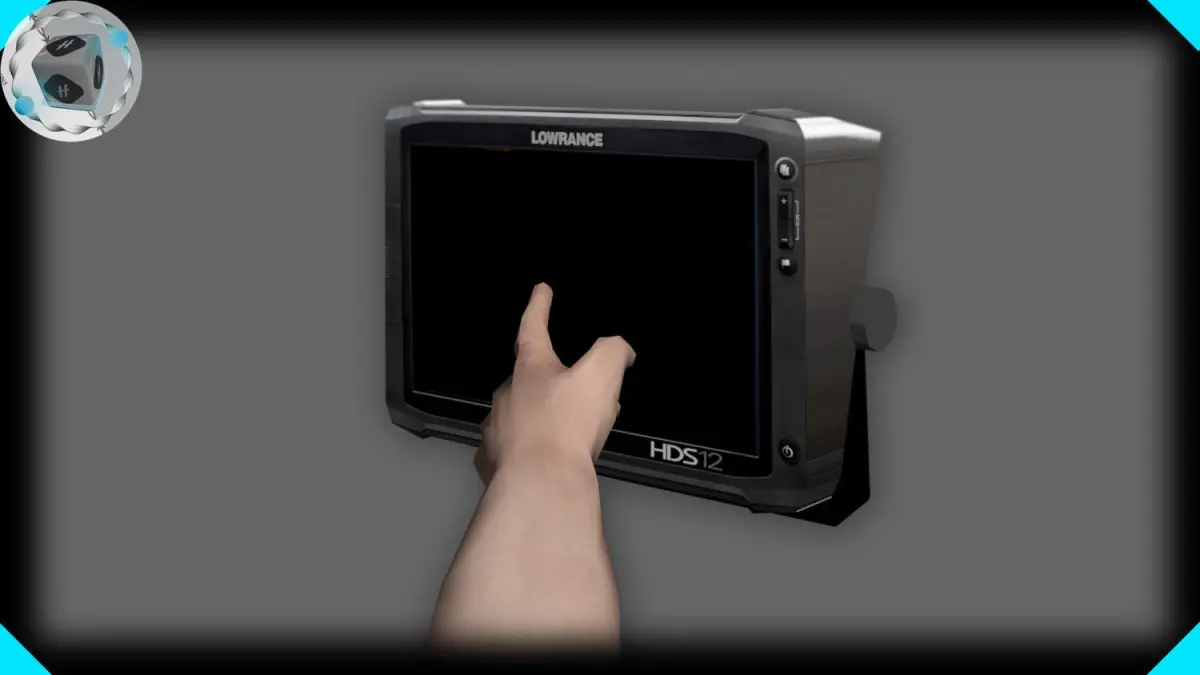 Lowrance fishing finder with hand rigged to point to screen. Lowrance screen is set up with MAX2AE plane so you can use any video on the screen.