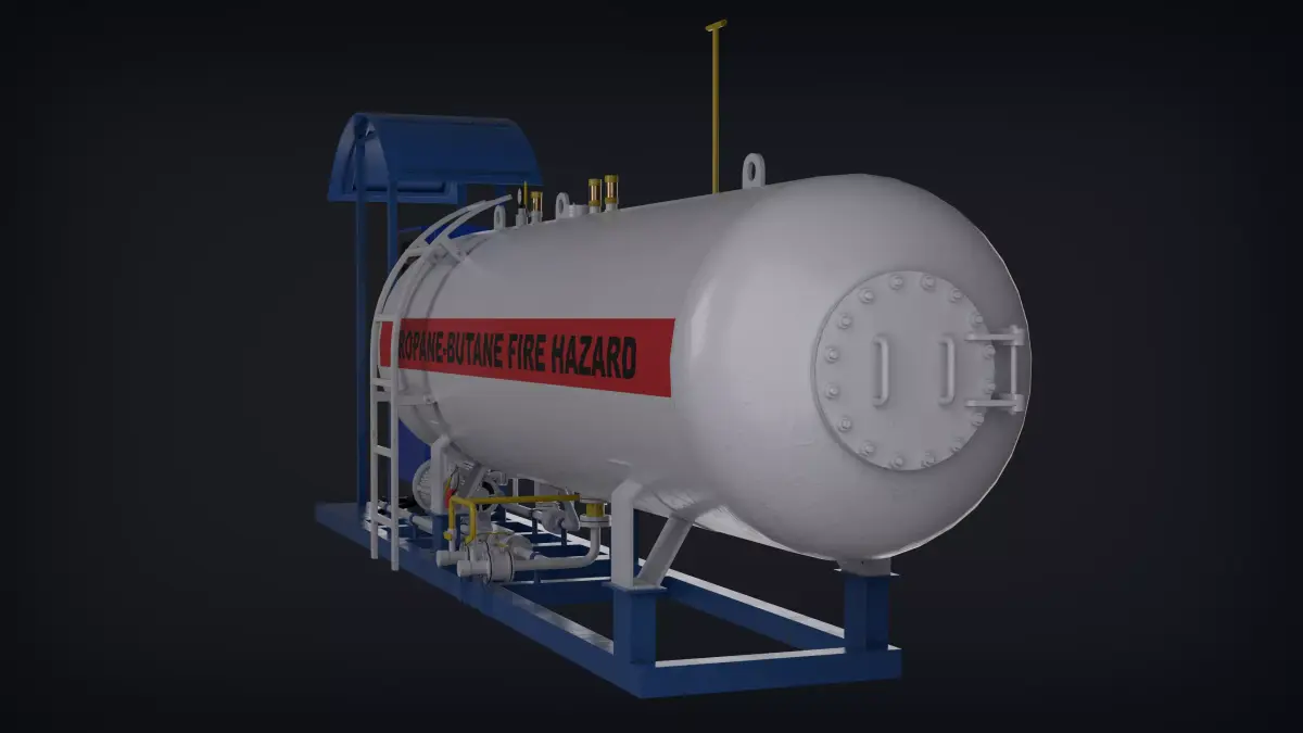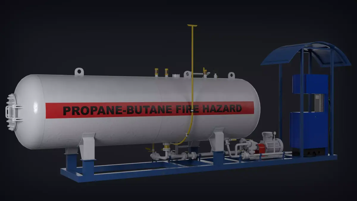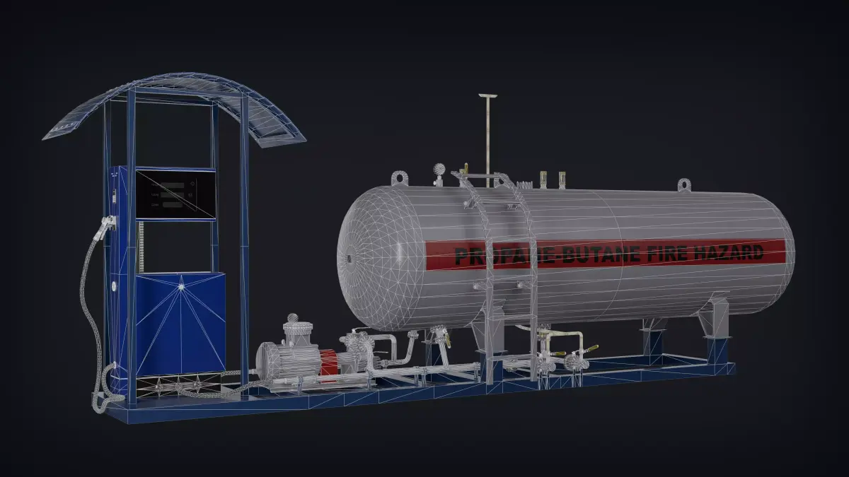 A high-quality 3D model of a LPG fuel station designed for use in industrial scenes, gas stations, or simulation projects.The model includes a detailed storage tank, fuel dispenser, piping system, electric motor and pump unit, and protective canopy.