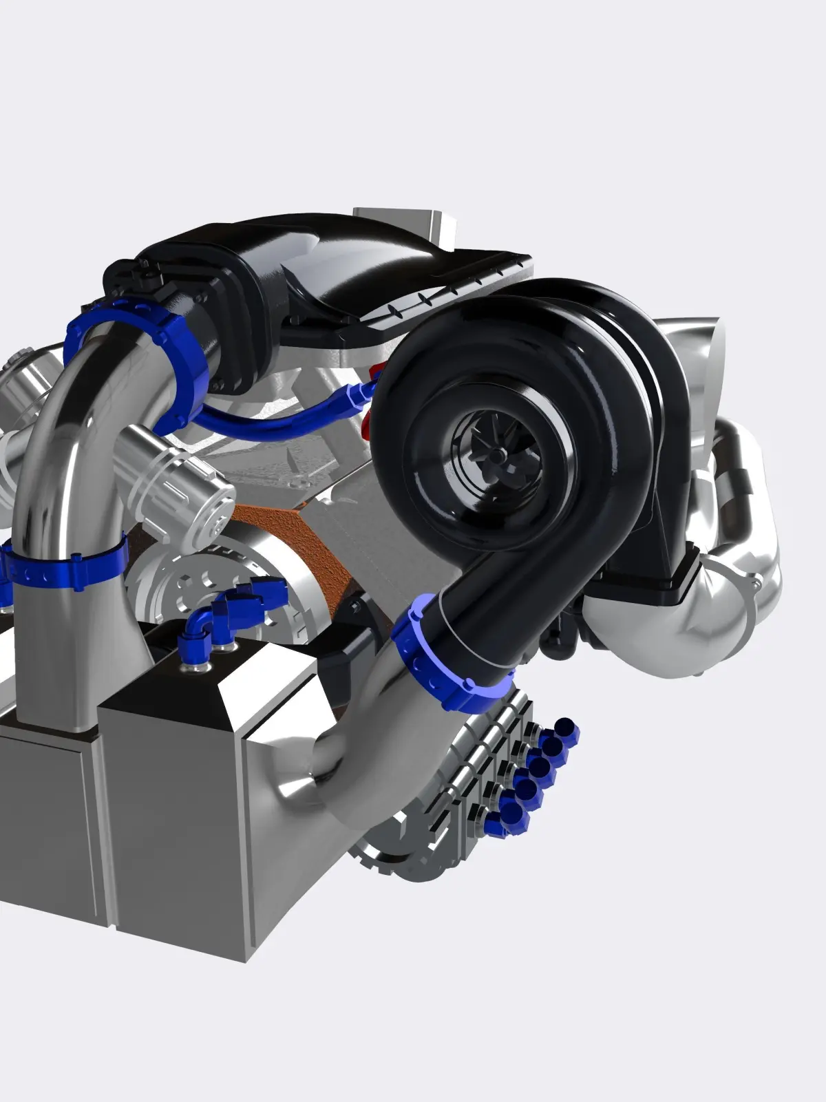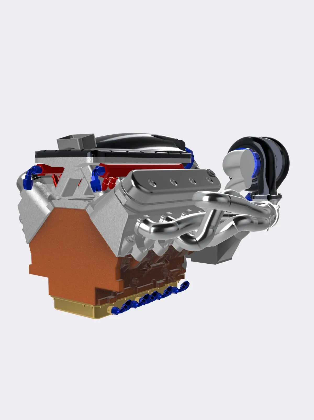 Designed from scratch is an LSX twin turbo motor, with water/air intercooler, and integrated AN fittings, high in detail, ideal for scale modeling (currently in 1/24 and 1/25 scale).