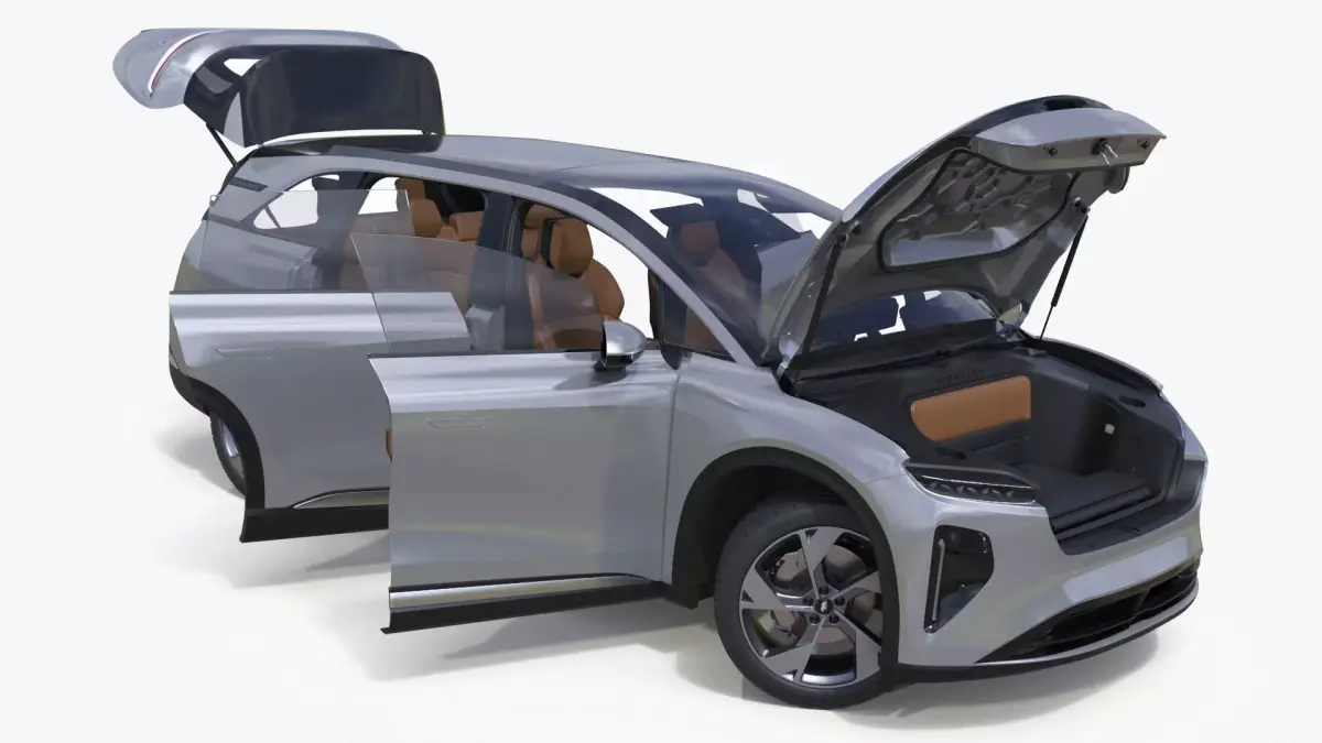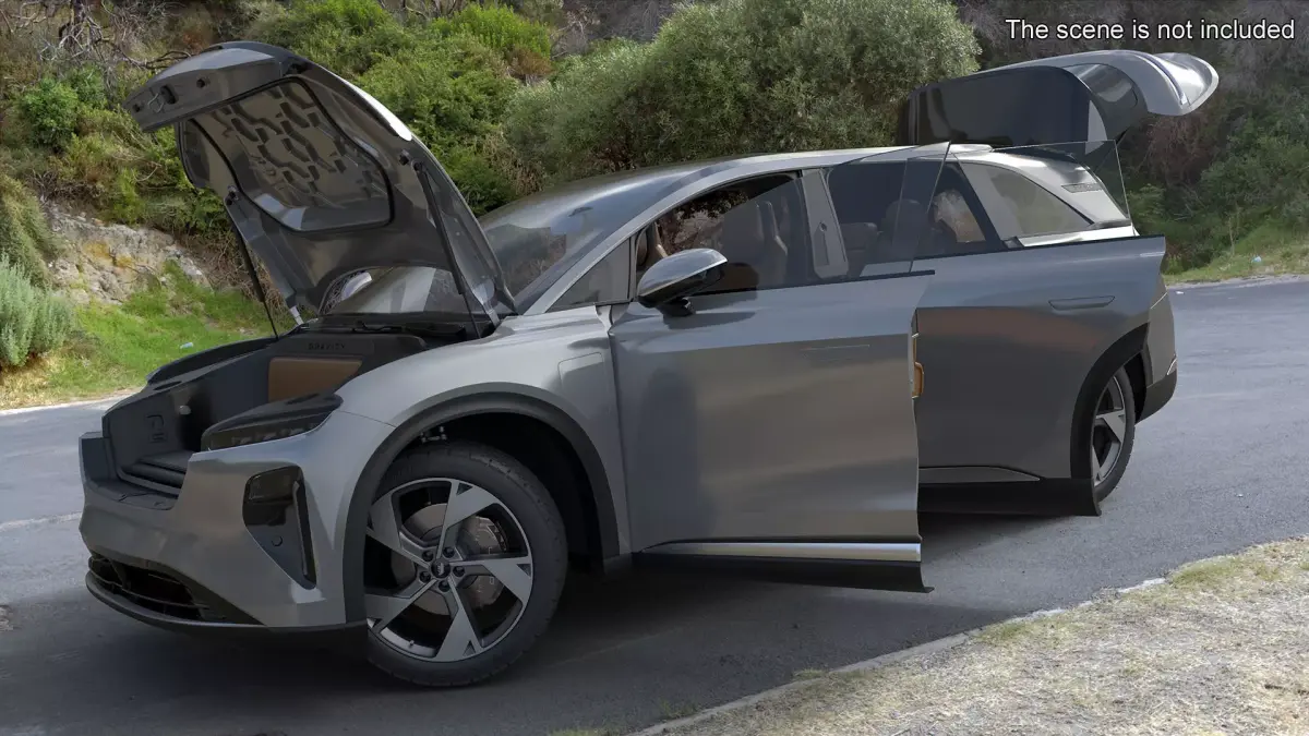 Lucid Gravity Electric Suv Gray with Lights Off Rigged for Maya is fully rigged and is ready to be animated in Maya. You can easily position it the way you need or animate it the way your project requires. See the screenshots to get an idea of how rigging works. The pose of the model on the render images is an example and can be recreated using rig, it is not initially included into the product.