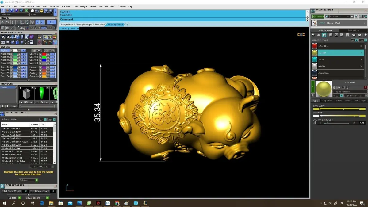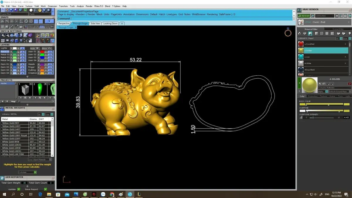 Technical information such as overall dimensions, volume, and estimated metal weight is clearly shown in the preview images. The geometry is clean, watertight, and optimized for casting in precious metals such as gold or silver.