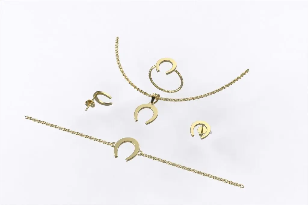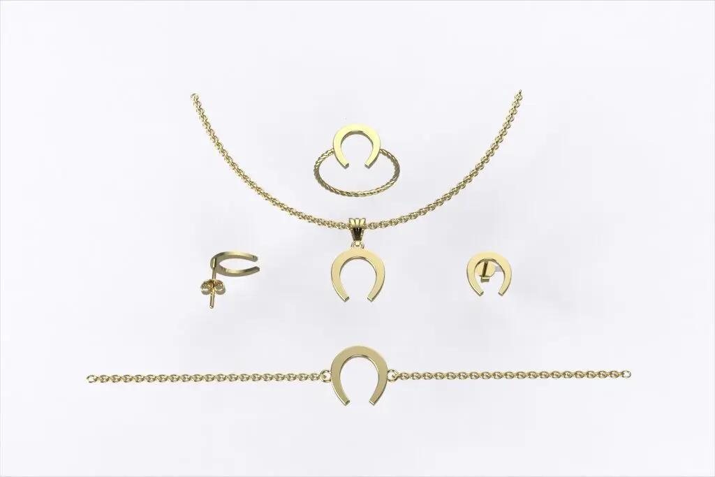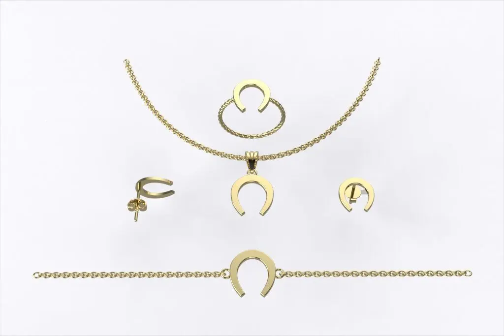 A modern yet symbolic 3D jewelry set featuring the iconic horseshoe shape, crafted in polished 18K yellow gold. This lucky charm-inspired design includes a matching necklace, bracelet, earrings, and ring, each showcasing clean geometry and high attention to detail. The open horseshoe form adds both meaning and elegance, making the set suitable for both casual wear and premium jewelry collections. Fully optimized for 3D printing or digital rendering.
