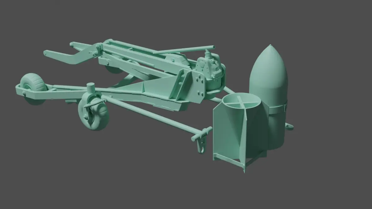 A 3d model of the ubiquitous Luftwaffe Hydraulic LWC-500 bomb loader, for bomb sizes up to 500kg, as used for many types of bomber & fighter bomber during WWII. Includes a 250kg bomb with a Stuka style cradle mount & separate towing arms.