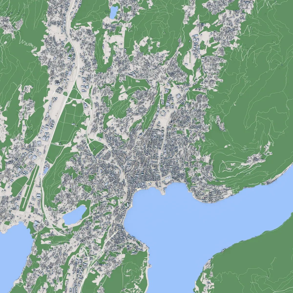 Beautiful 3D model of Lugano, a Swiss city nestled by a lake, known for its picturesque views and organized urban layout.