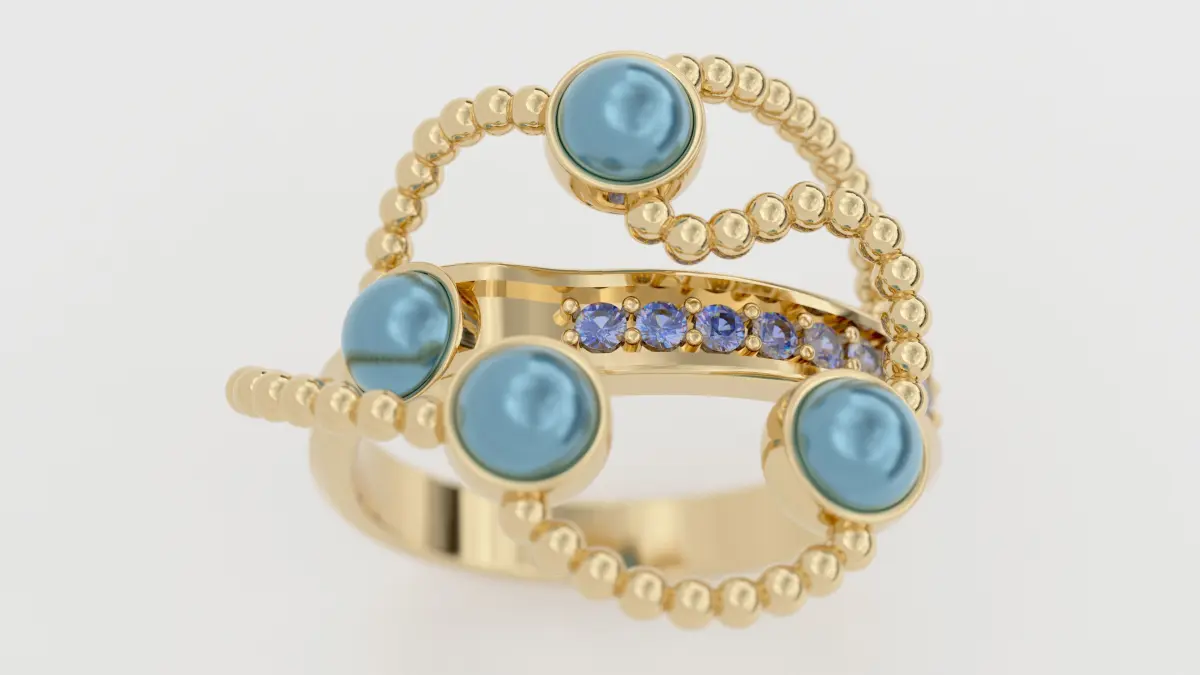 This artful ring features a dynamic, multi-layered design crafted in rich yellow gold. Four lustrous light blue pearls are elegantly set, forming a captivating, undulating silhouette across the finger. Complementing these are a row of vibrant blue sapphires (or tanzanites) meticulously set along the central band, adding a deeper tone of sparkle. The entire composition is framed and connected by exquisite, beaded gold strands, creating a unique texture and fluid motion that truly sets this piece apart.