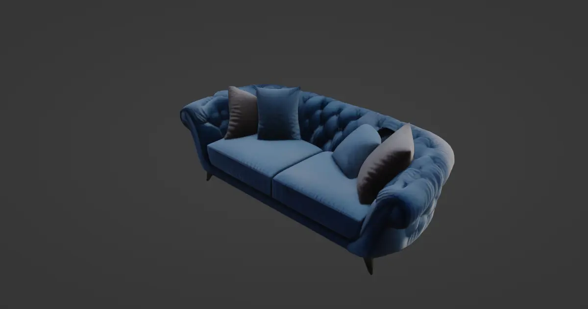 This elegant 3D model showcases a luxurious velvet designer sofa inspired by the timeless Chesterfield aesthetic. The sofa features a deep button-tufted backrest and armrests, with gracefully rolled arms that provide both visual charm and ergonomic support. The model is crafted with smooth, rounded contours and a plush texture that radiates sophistication and comfort. Its rich blue upholstery is paired with sleek, tapered wooden legs, offering a beautiful contrast between classic opulence and modern minimalism.Accompanying the main seating area are five accent pillows in complementary tones of blue and charcoal gray, adding layers of depth and realism to the overall scene. The soft velvet fabric is depicted with subtle lighting effects to emphasize the luxurious texture, while the folds and creases in the cushions are meticulously modeled to enhance authenticity. The proportions and scale of the sofa make it suitable for upscale interior scenes, including living rooms, luxury lounges, or boutique hotel environments.This 3D model is downloadable in .gmb format, with the full texture set included, ensuring plug-and-play compatibility with your favorite 3D rendering engines. For greater flexibility, it is also available in .fbx format, making it ideal for integration into game engines, architectural visualization projects, or animation pipelines.Whether you're staging a virtual environment or designing a digital showroom, this velvet designer sofa model adds high-end character and realism. It is a versatile asset that balances vintage style with contemporary flair, delivering both visual richness and ease of use in professional projects.