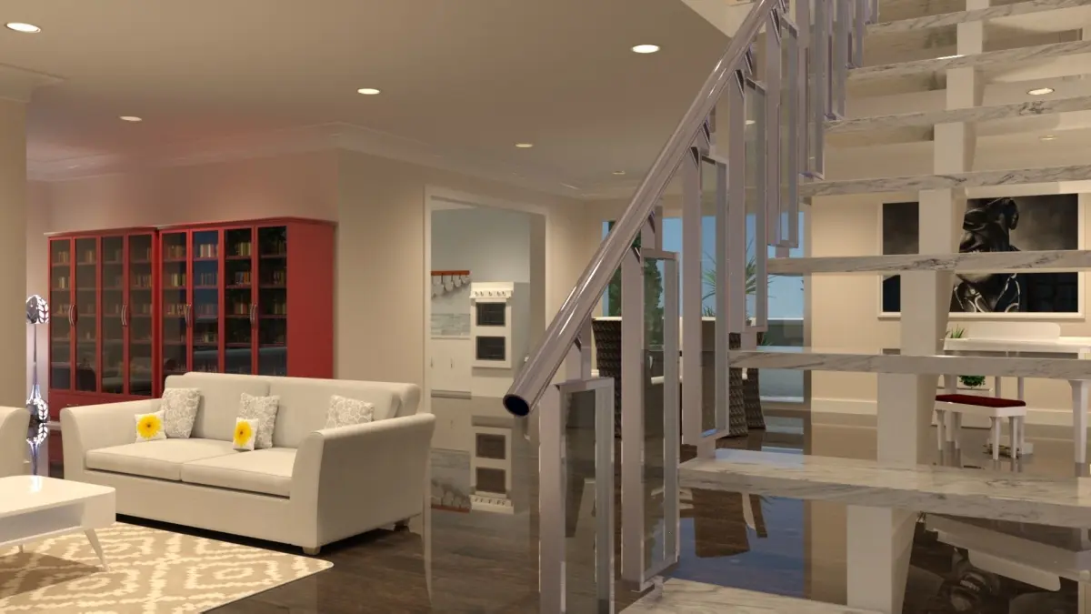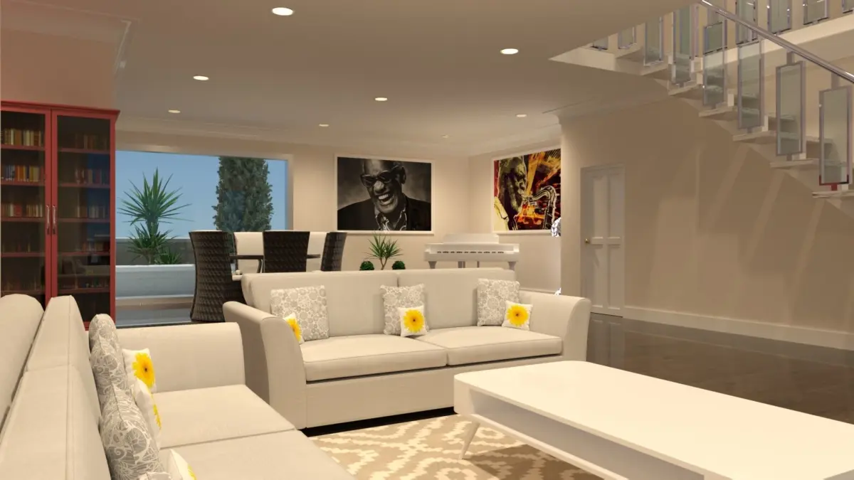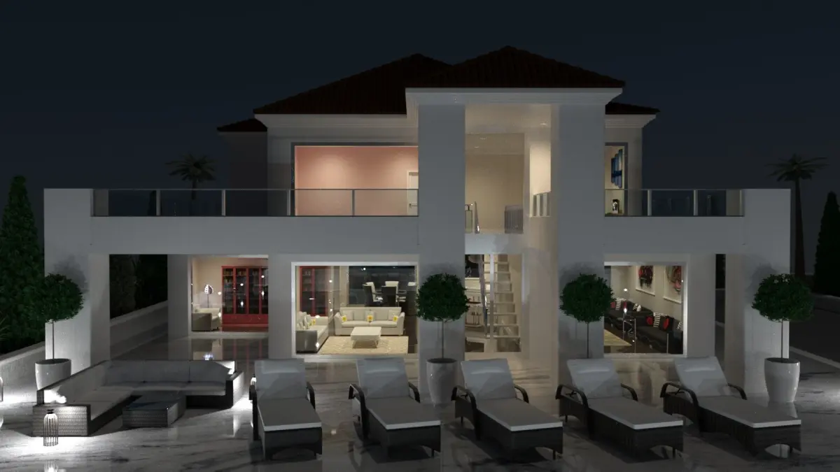 A luxury villa style house with garden and pool.This house has a large main room with family seating area,dinning table and chairs,reading area and book cases and a grand piano in the back corner.Open kitchen leading off the main room with fully fitted units,sink,fridge freezer,microwave and double oven with a breakfast bar and buffets.A seperate tv viewing room with two three seater sofas and large wall mounted tv and surround speakers.Three large upstairs bedrooms. Two with double beds one with two single beds and each fitted with bedroom furniture such as wardrobes, chest of draws and bedside cupboards.The bathroom has a seperate bathtub and walk in shower wet room with wash basin and toilet. Trimmed in large very light grey tiles with recessed bath side glass shelfs.There is also a small office space on the upstairs landing with a desk and office chair with desktop pc, monitor, keyboard and mouse.The garden has a white marbel base with a driveway and swimming pool with sun loungers and a family seating area by the pool. The garden is lined with plam trees, ferns and plantsand surrounded by a white stone wall with smooth white stone trimes on top.