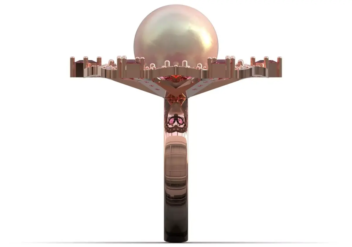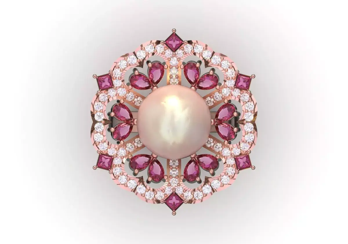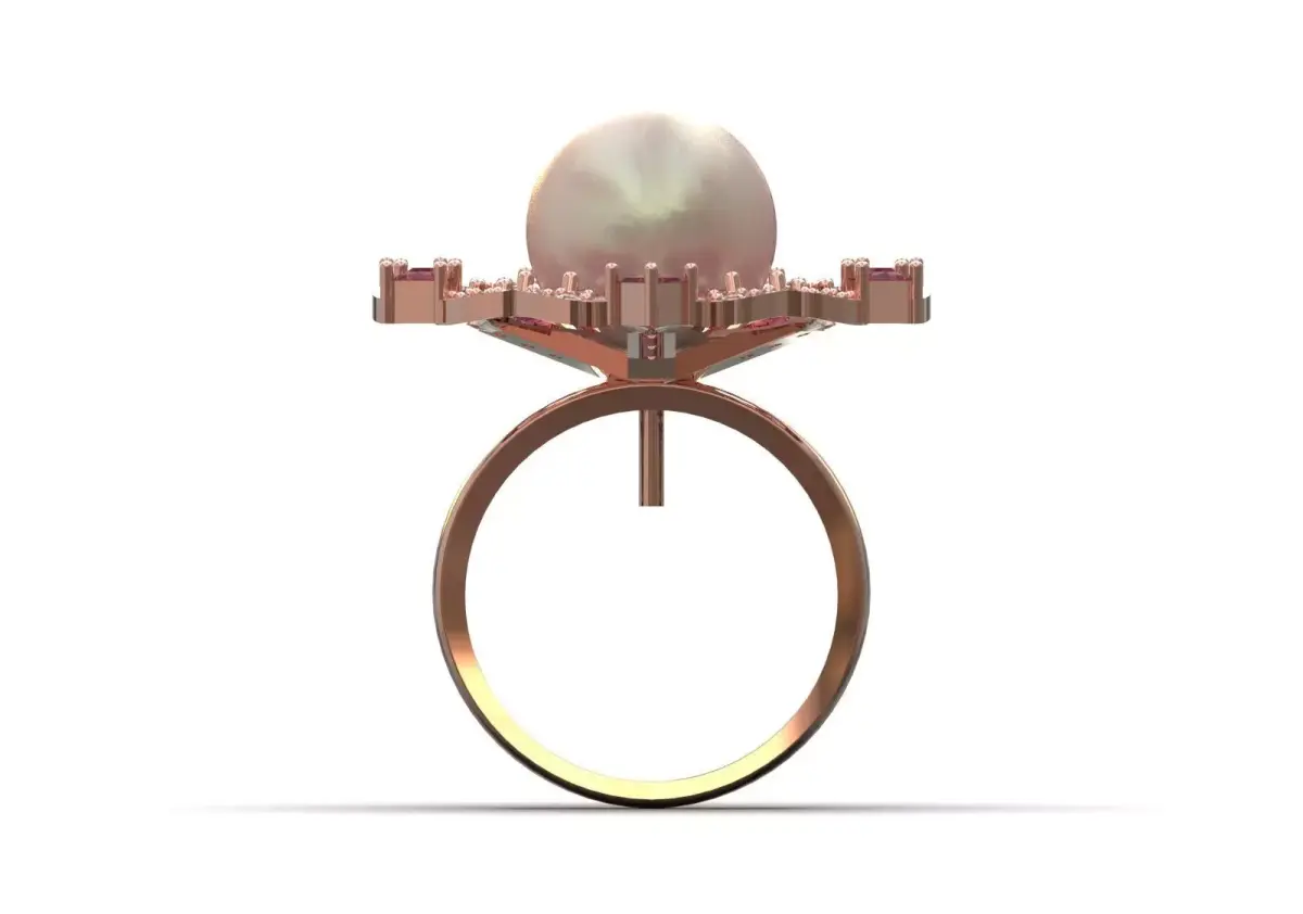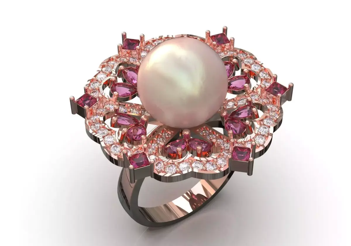 - Rose Gold Metal: This ring is made entirely of Rose Gold, whose warm color beautifully complements the pink gems and pearls.