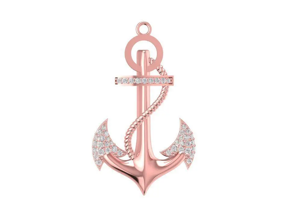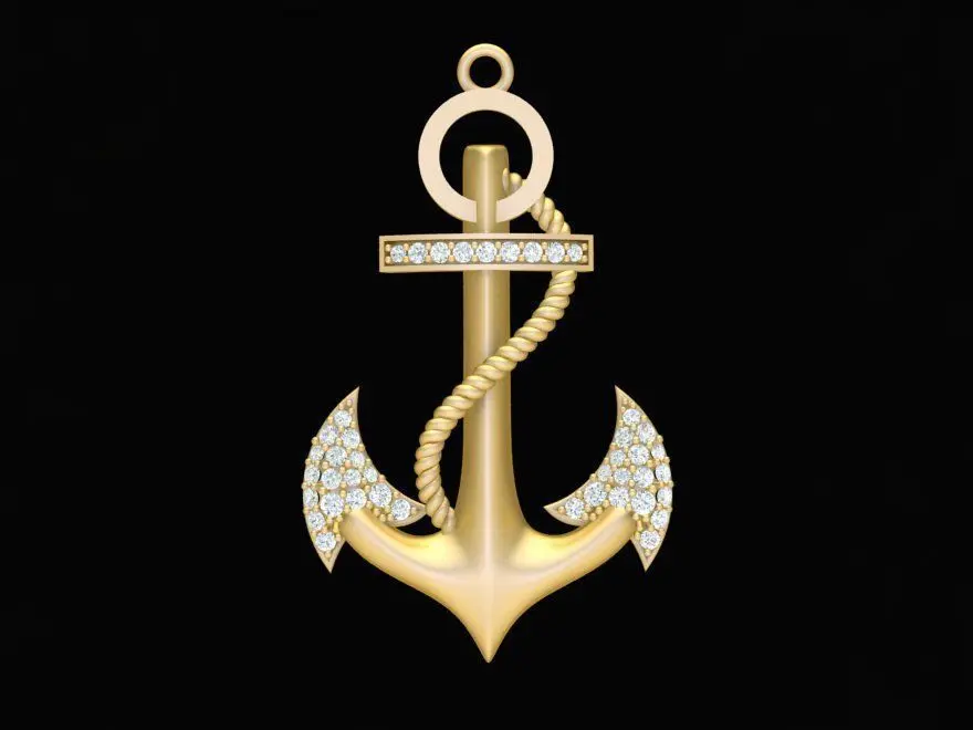 This 3D model showcases a luxury anchor pendant symbolizing stability, strength, and protection. The anchor body features elegant curves and gemstone settings along the crossbar and flukes, creating a refined and modern maritime style. The design is ideal for production in gold, rose gold, or silver with gemstone or diamond accents.