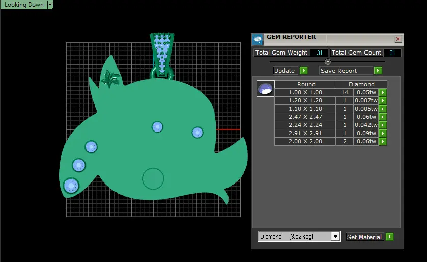 The model depicts a polished, golden pendant, likely intended for jewelry.Its design abstracts the form of a marine mammal, possibly a dolphin or a stylized whale, characterized by a prominent snout/head and a curved body.The pendant is adorned with several round-cut emerald gemstones set into its surface, adding a touch of color and luxury.A bail or loop, also crafted from gold and potentially featuring smaller emerald accents, is integrated at the top, indicating its purpose as a wearable charm or necklace component.