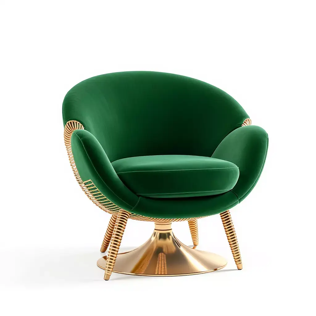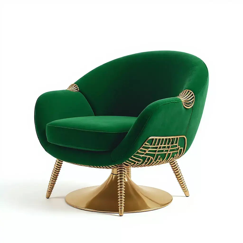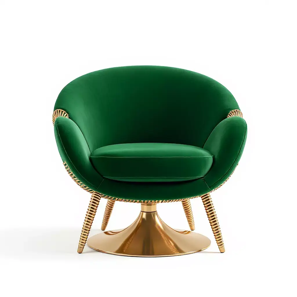This luxurious and modern armchair features a unique design that combines a rich green velvet upholstery with elegant gold accents, adding a touch of beauty and sophistication to any space. The body of the chair is covered in soft, high-quality green velvet that offers incredible comfort. The metallic gold base, with its sleek, spiral shape, is meticulously crafted, giving the chair a modern and stunning appearance. This armchair is ideal not only for everyday use but also for luxury and decorative spaces.