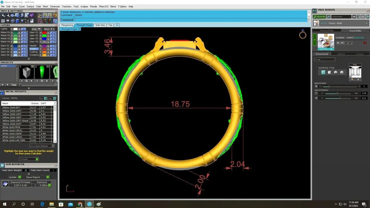 All dimensions, stone sizes, volume, and estimated metal weight are clearly displayed in the preview images. The model is fully solid, watertight, and optimized for precious metal casting in gold or silver.