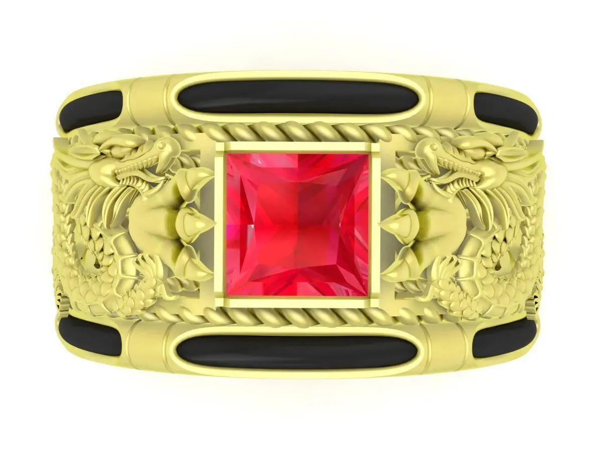 The ring features a detailed sculpted dragon body wrapping around the band, combined with a square gemstone setting at the center. The bold structure and ornamental engravings create a strong visual impact, making this design ideal for statement men’s jewelry.