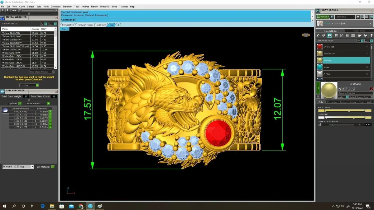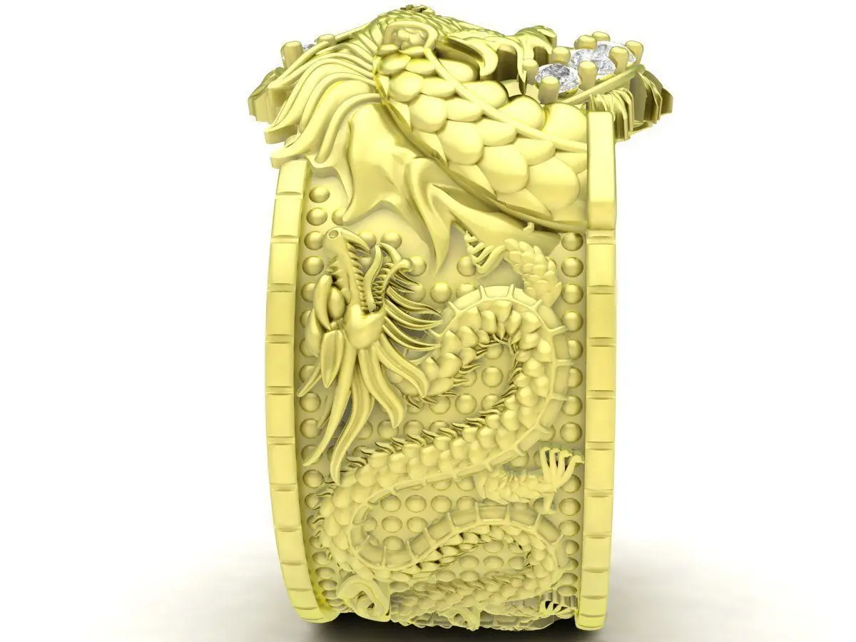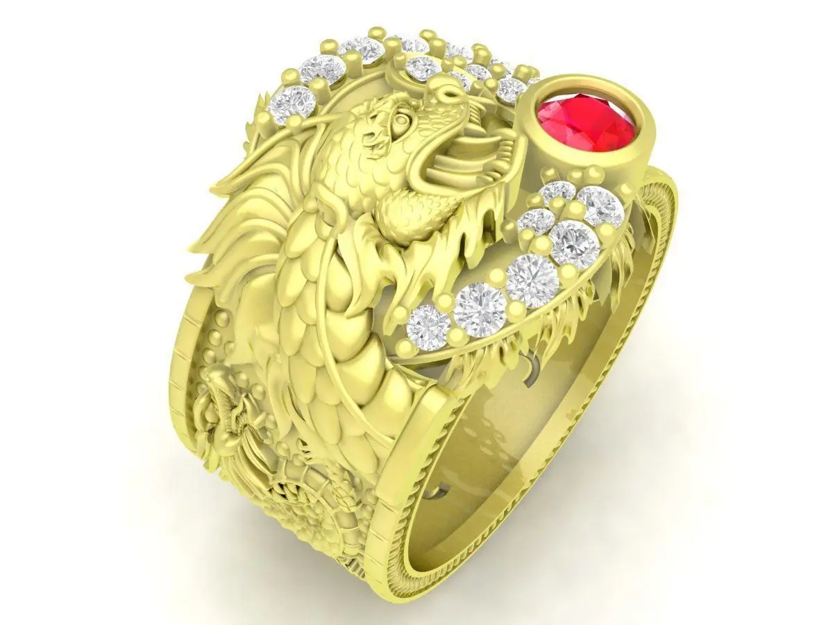 The 3D model is professionally sculpted with high-detail dragon engravings, deep relief textures, and precise stone settings. The ruby is positioned as a focal point, while surrounding diamonds enhance brilliance and visual balance. The wide band structure provides a strong, masculine presence and ensures durability during production.