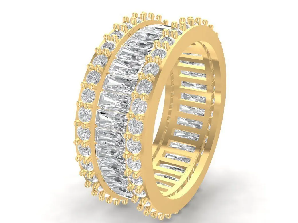 This 3D model showcases a luxury baguette and round diamond eternity ring for women, featuring two parallel rows of gemstones that create a bold and refined sparkle.