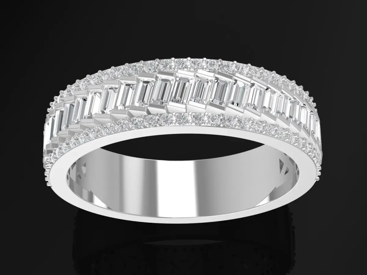 This luxury baguette cut eternity band ring jewelry design showcases a refined and timeless aesthetic with continuous brilliance. The ring features a full circle of precisely aligned baguette-cut gemstones, creating a clean, elegant profile with strong visual rhythm and symmetry.