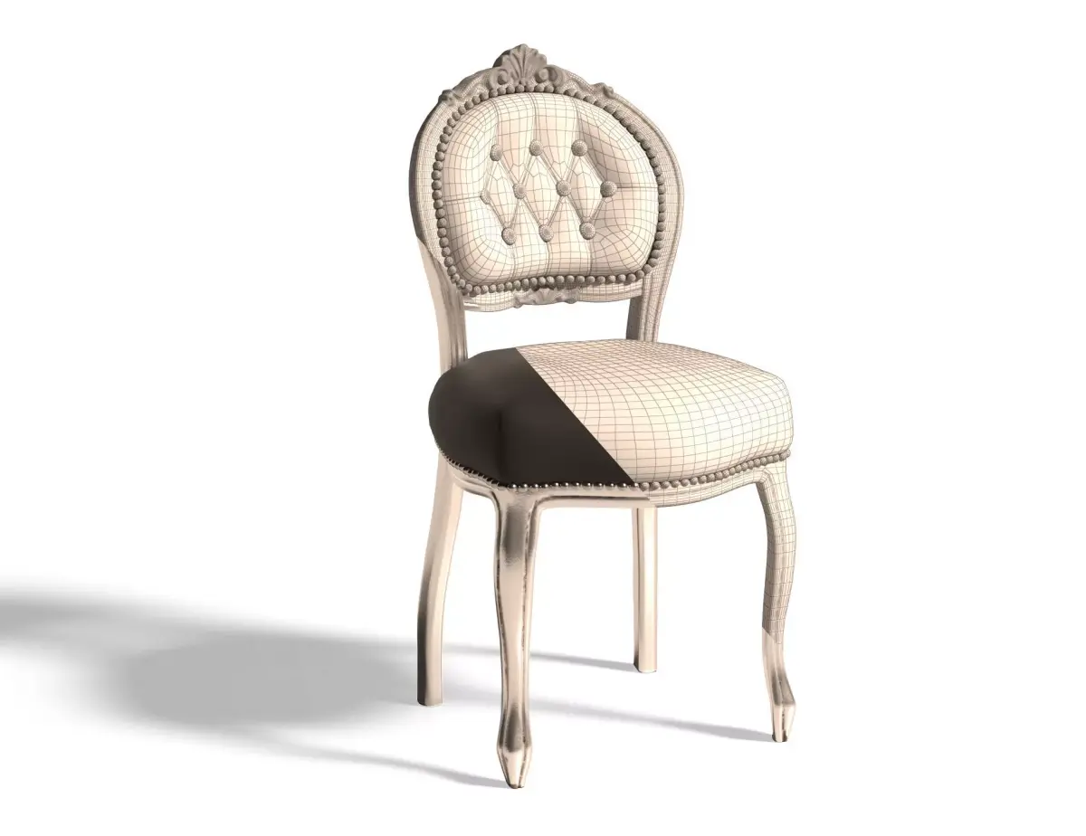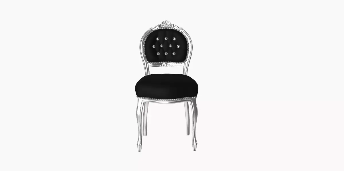 This 3D model represents a luxurious Baroque-style dining chair, featuring a beautifully carved silver wooden frame and plush black upholstered seat and backrest. The backrest is designed with elegant tufted details and decorative studs, giving it a regal and timeless look.