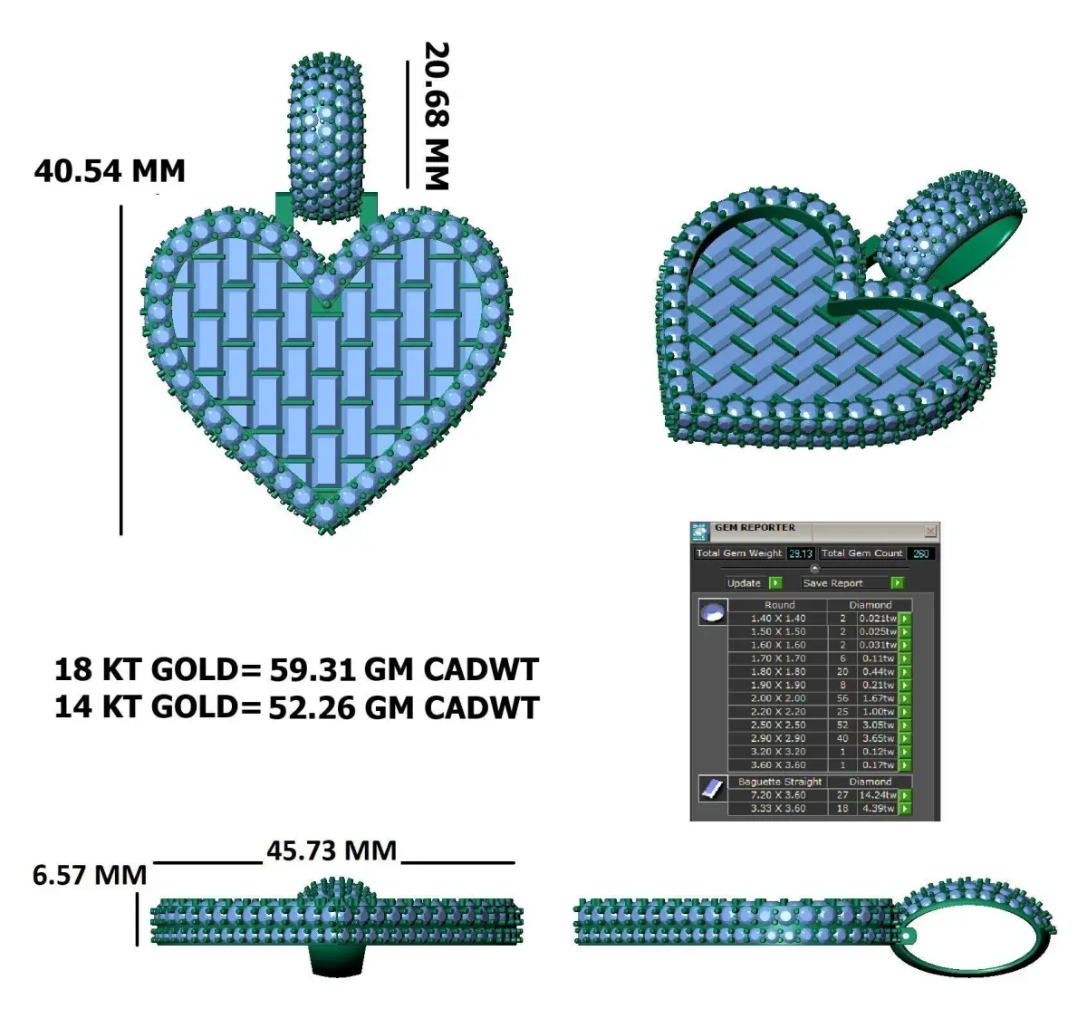 With a width of 40.54mm and a height of 20.68mm (excluding the bail), this pendant makes a bold yet elegant statement. The pendant is substantial in weight, with a CAD weight of 59.31 grams in 18K gold and 52.26 grams in 14K gold, ensuring a premium and luxurious feel.