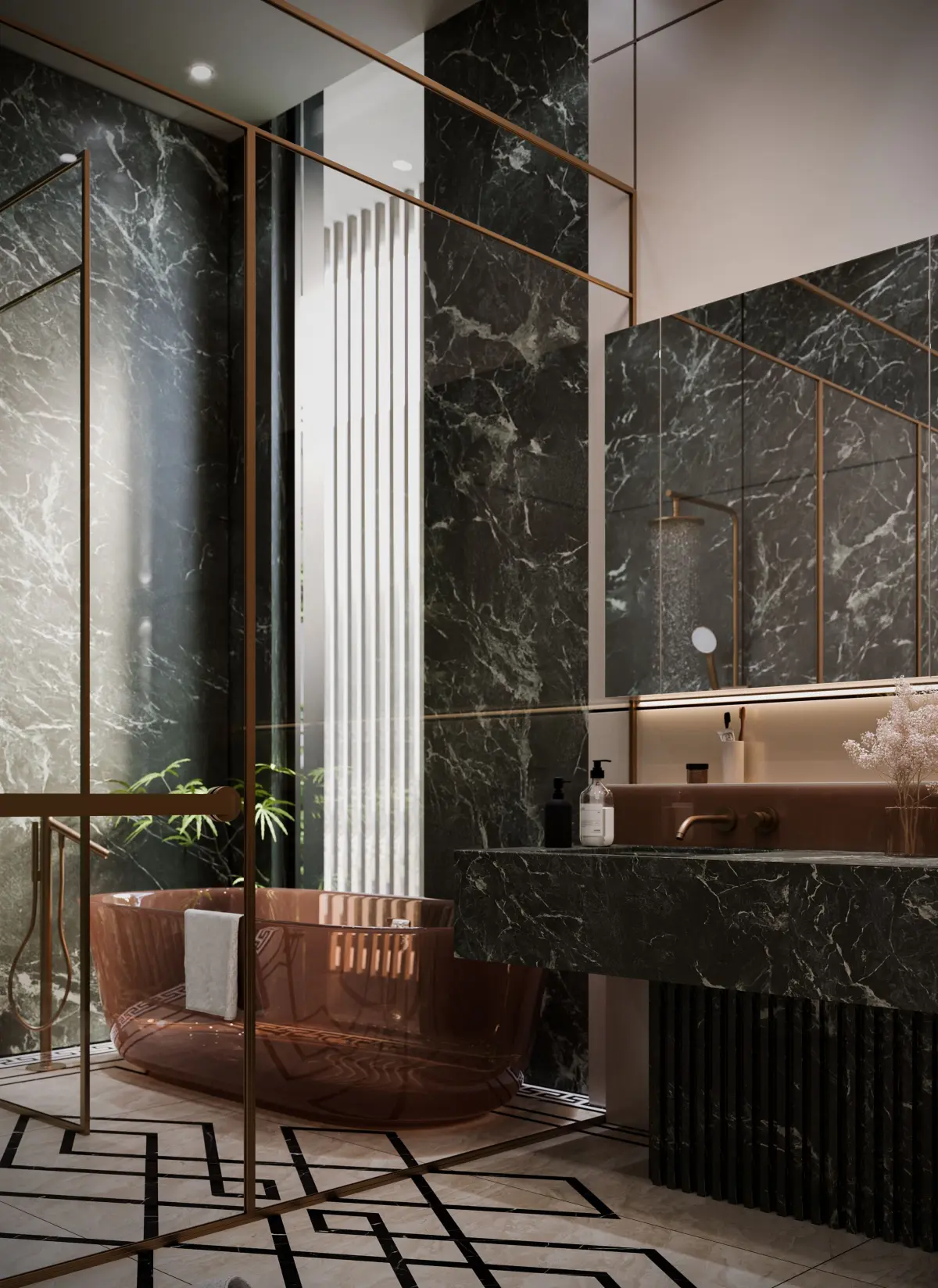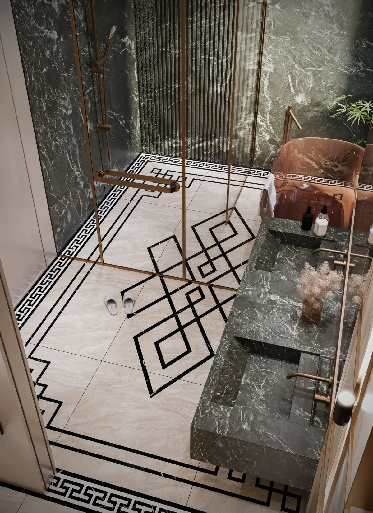 This high-end luxury bathroom 3D model features a meticulously designed space that exudes elegance and sophistication. The scene is centered around rich green marble walls with natural veining, complemented by a matching double vanity sink and premium brushed bronze fixtures. The design includes a walk-in glass shower with a rainfall head, a sculptural freestanding copper bathtub, and intricate black geometric inlays on polished marble flooring for added visual impact.