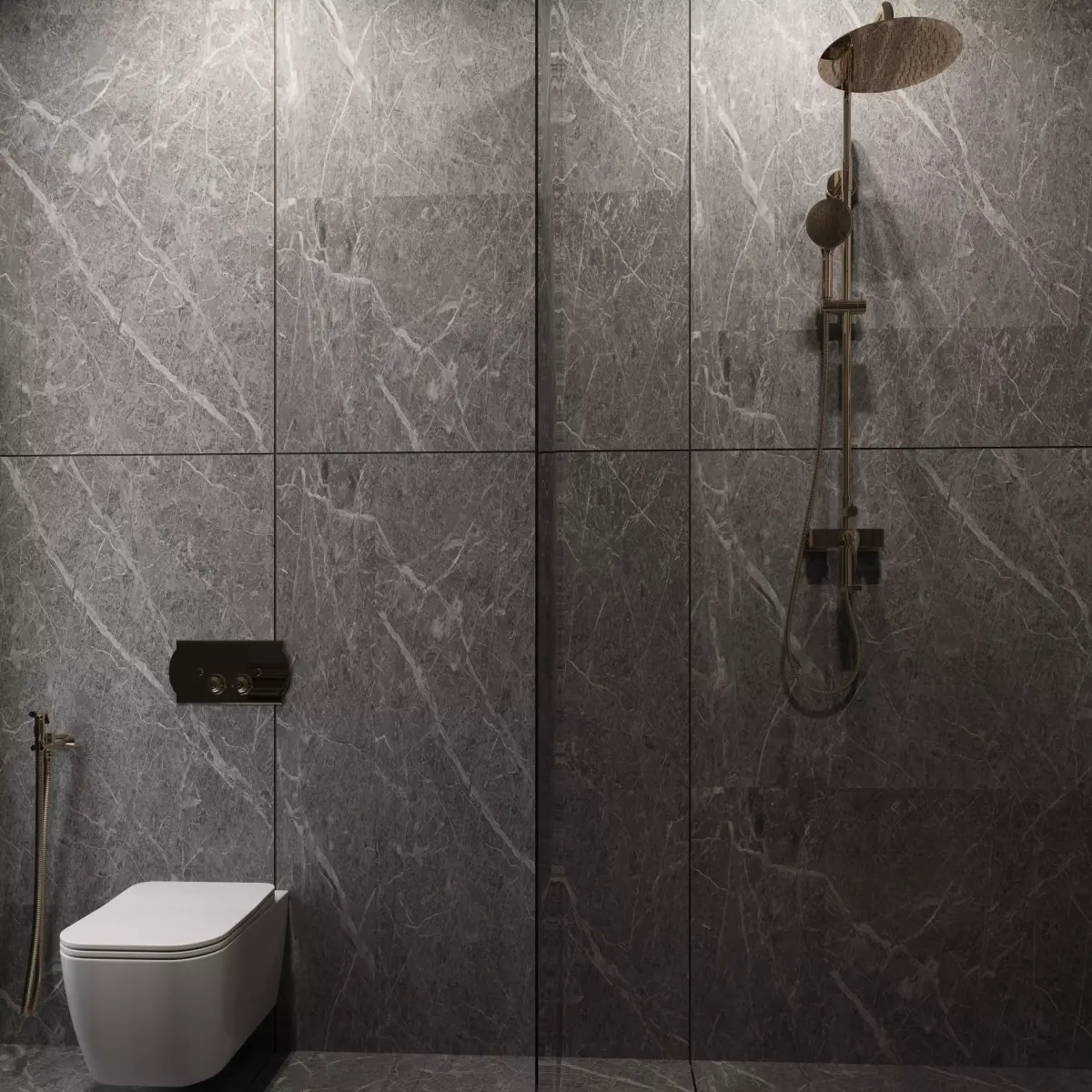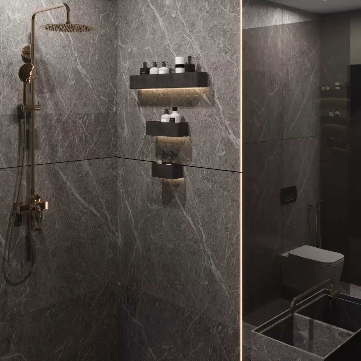 This luxury bathroom design features a striking gray stone finish that balances elegance and practicality. Warm accent lighting embedded in the walls and ceiling creates a spa-like ambience.Lighting and object visibility are optimized per camera:Bathroom fixtures highlighted with focused lights.Background elements softened to maintain the viewer’s focus.