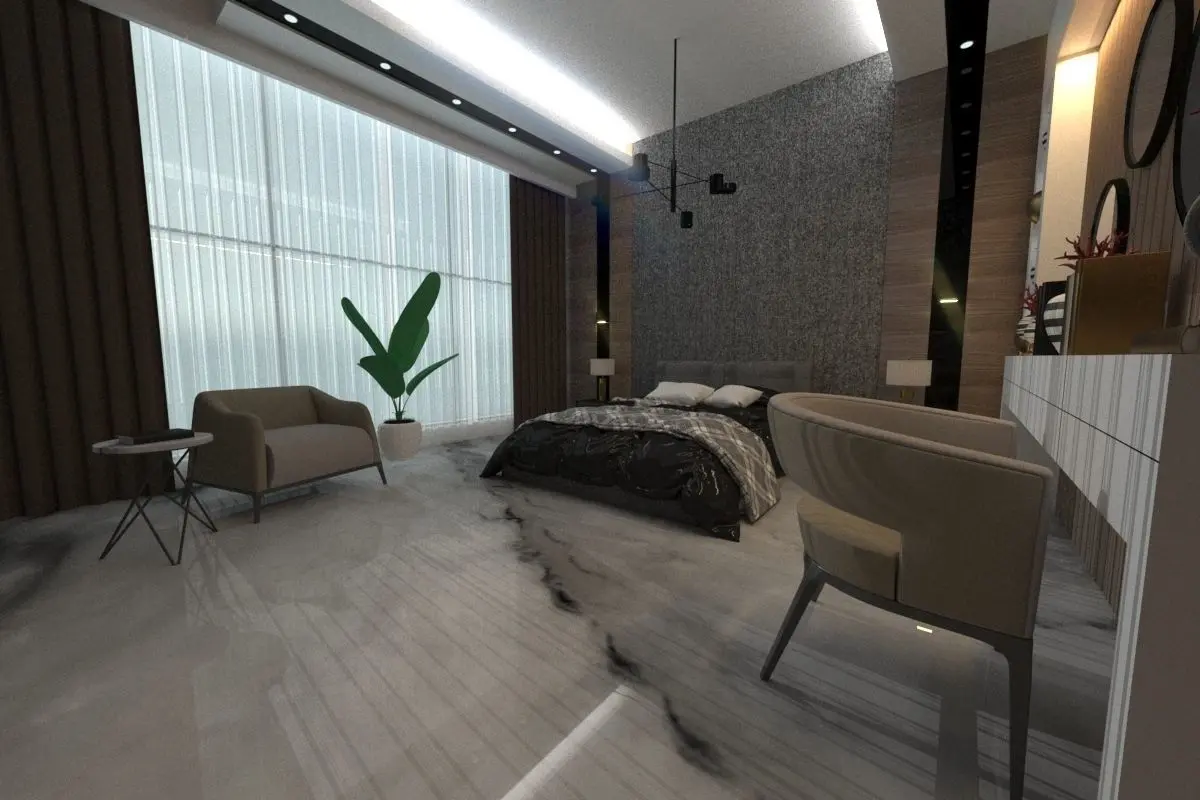 High end luxury master bedroom project, in this project dark colors are used asthe requiest of the clientn simples design in the backwall that combin the wallwith ceilling, dark cermic was used on tailing on the other side we have a deskand a another simple design with indirect lights on the sides with three sizedmirrores, on the facing wall we have 3,40cm height wall with combineddesigned useing concret, and other sided wall contain a large window formatwith high curtines with two coloers, as for the furintuing two simple chairs withbeij color are used and one coffe table plus the plant beside the chair.