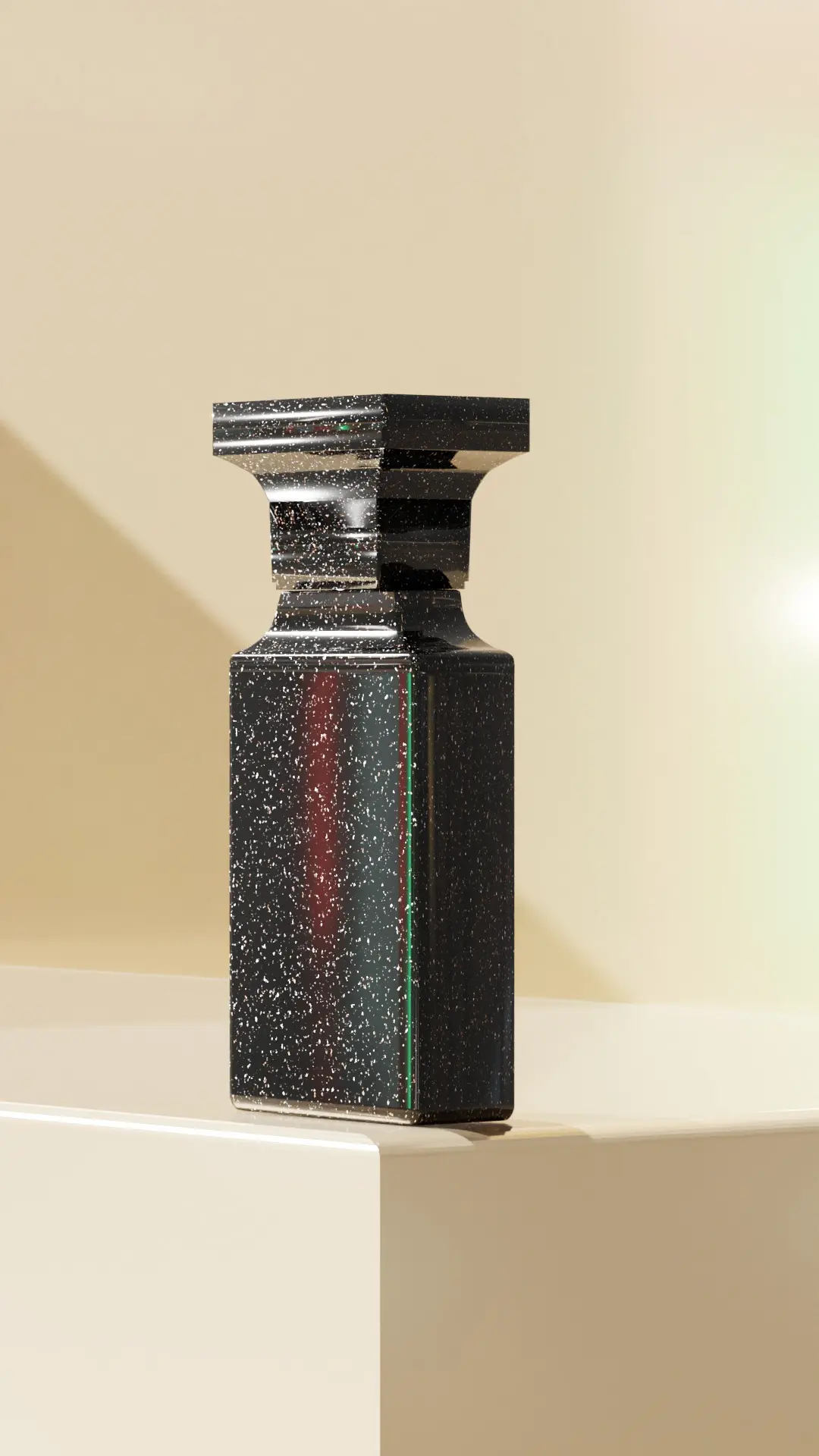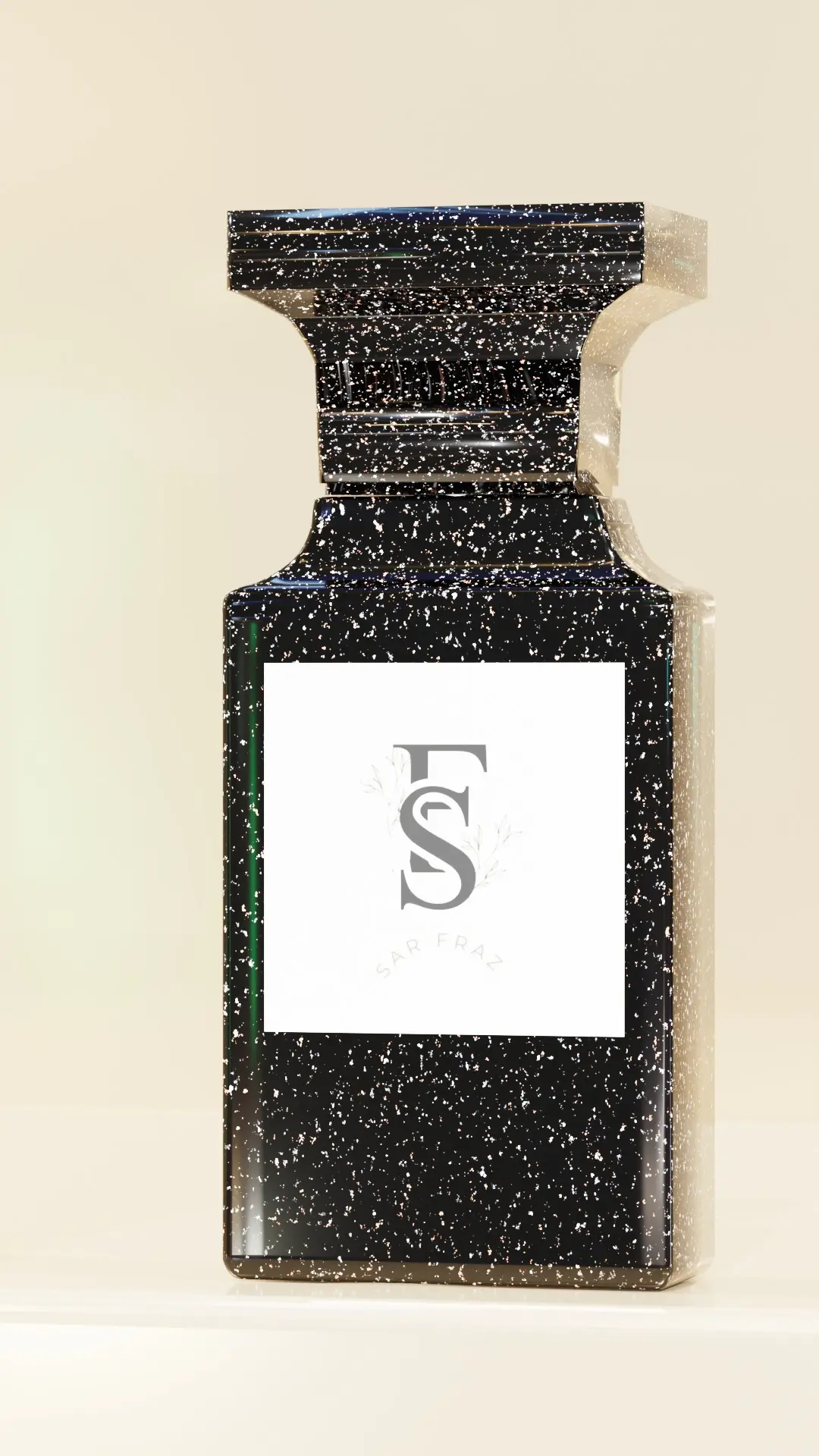 This 3D model showcases a luxury perfume bottle with a sleek black design enhanced by subtle white speckles, providing a modern and high-end look. The bottle features an elegant and minimalistic logo design labeled SAR FRAZ, making it perfect for branding, advertising, and visualization projects in the fragrance or cosmetic industries. Ideal for use in product renders, packaging design mockups, or 3D environments. The model is detailed and carefully textured, ensuring realism while being optimized for various 3D applications.